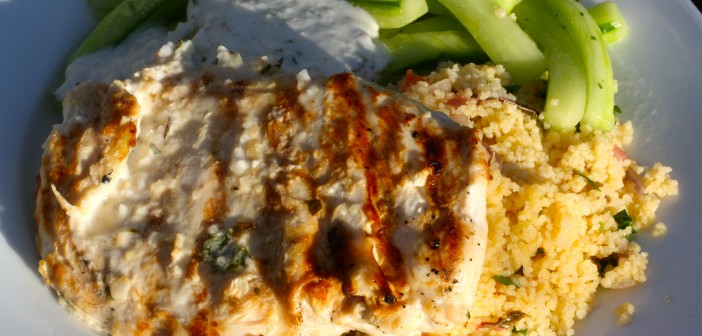 Grillið kjúklinginn og penslið einu sinni eða tvisvar með maríneringunni. Berið fram með tabbouleh couscous (þar notar maður blöðin af myntustönglunum) og estragongúrkum.