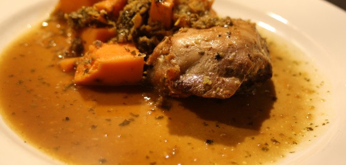 Brúnið kjúklingabitana í olíu á pönnu og setjið síðan ofan á kartöfluteningana. Eldið í 200 gráðu heitum ofni í 20 mínútur. Takið þá fatið út, snúið kjúklingabitunum við og eldið áfram í aðrar 20 mínútur.