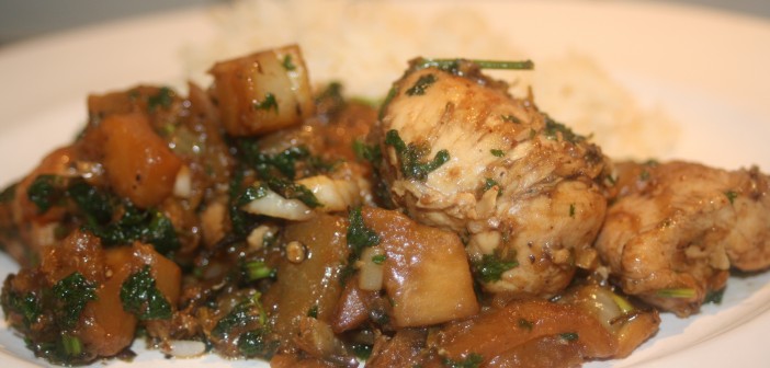 Berið fram með hrísgrjónum soðnum í kjúklingasoði (ein teskeið af krafti út í vatnið og klípa af þurrkuðu rósmarín).