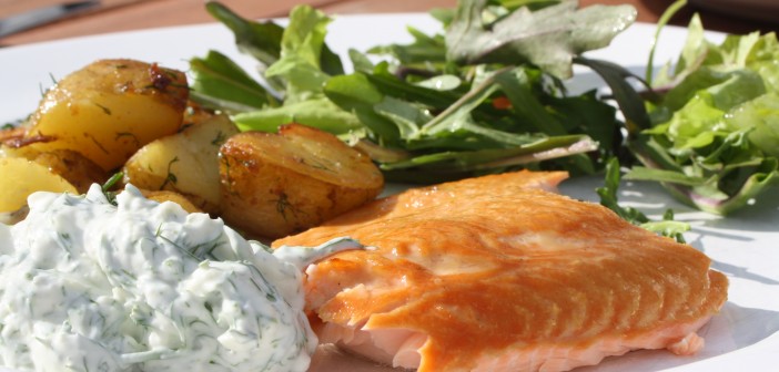 Nýr silungur og nýjar kartöflur eiga afskaplega vel saman og hér kórónum við það með ljúffengri sósu þar sem við blöndum saman dilli og geitaosti.