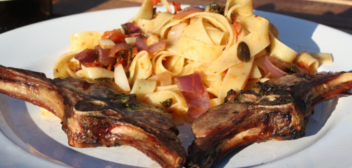 Þessi réttur byggist á því að grilla kryddjurtafyllta tómata og rauðlauk sem mynda síðan grunninn í pastasósu sem við berum fram með lambi eða nauti. Þetta er fullkomið með safaríkum íslenskum lambakótilettum en lambafile eða jafnvel ribeye af nauti njóta sín ekki síður vel í þessu samhengi.