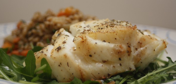 Setjið byggotó á disk, þá skammt af klettasalati og loks þorkssneiðina ofan á salatið. Hellið smá af hágæða ólívuolíu yfir þorskinn og berið strax fram.