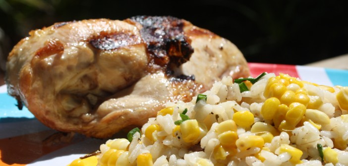 Þessi uppskrift að maísrisotto með sætu lauksmjöri passar einstaklega vel við grillaðan kjúkling. Best er að grilla bringur og læri á beini. Sömuleiðis er best að elda ferska maískólfa í ofni eða á grilli og skafa korninn af. Það er þó líka hægt að nota maís úr dós.
