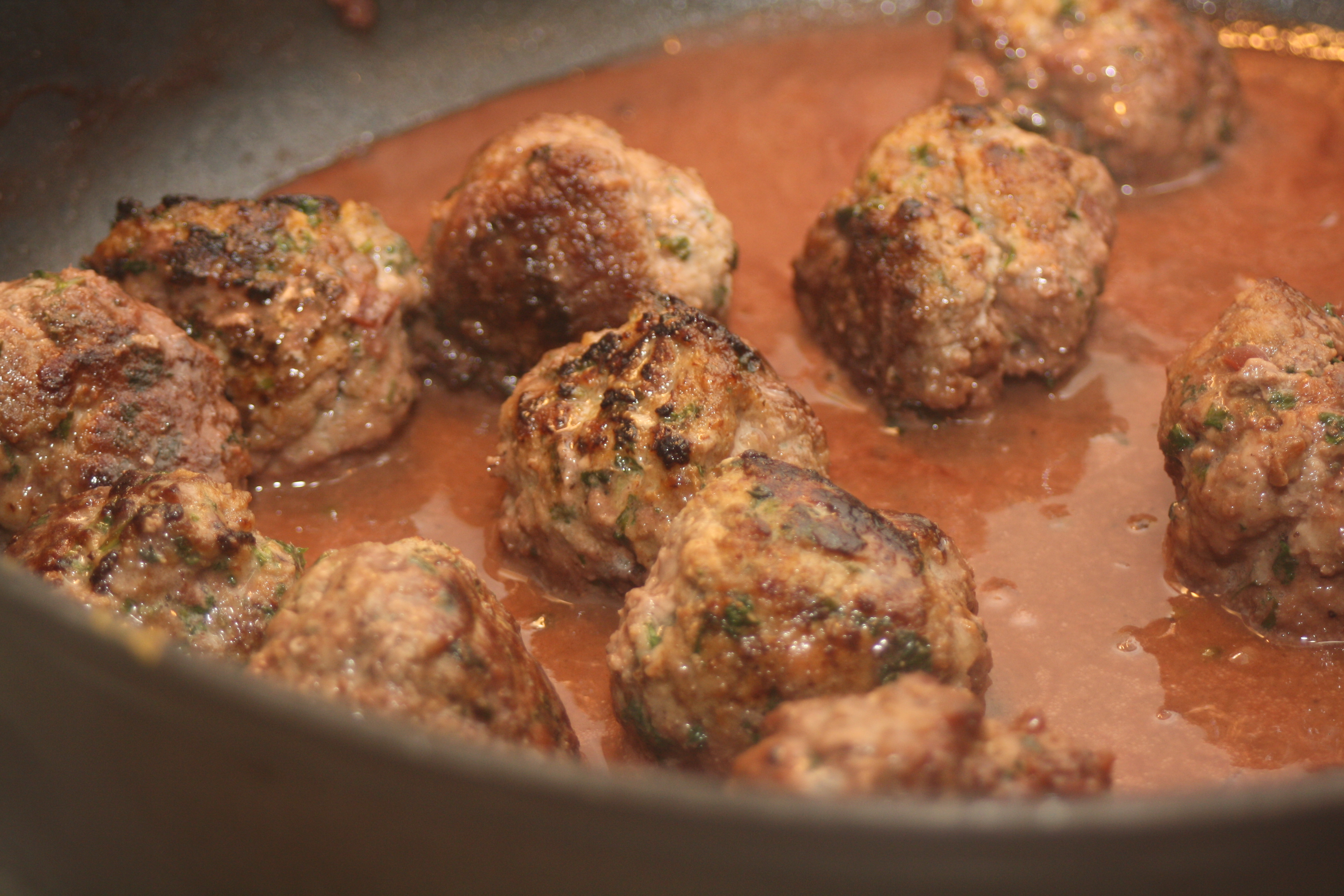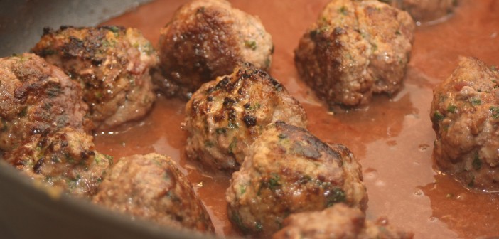Þessar kjötbollur eru bragðmiklar en það er hins vegar djúp og kröftug sósan sem er lykilatriðið í þessari uppskrift.