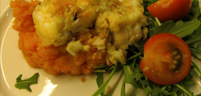 Sætar kartöflur fara einkar vel með sjávarfangi og hér er einfaldur tiltölulega fyrirhafnarlítill forréttur fyrir fjóra sem auðvelt er að breyta í aðalrétt með því að tvöfalda eða þrefalda uppskriftina.