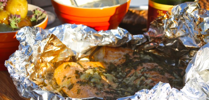 Með því að pakka bleikjunni og kryddjurtum inn í álpappír myndast góð soðsósa úr hvítvíninu. Hæglega má skipta út bleikju fyrir lax.