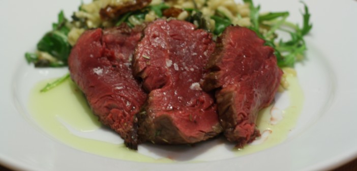 Takið lundina úr ísskáp að minnsta kosti klukkustund áður en hún er elduð þannig að hún sé við stofuhita. Nuddið lundinni upp úr smá ólífuolíu, sjávarsalti, pipar, rósmarín og timjan. Grillið eða steikið í um 3 mínútur á hvorri hlið. Setjið inn í 125 gráðu heitan ofn í um 10 mínútur. Þá ætti hún að vera rare, medium-rare. Leyfið að standa í um 10 mínútur áður en hún er sneidd niður.