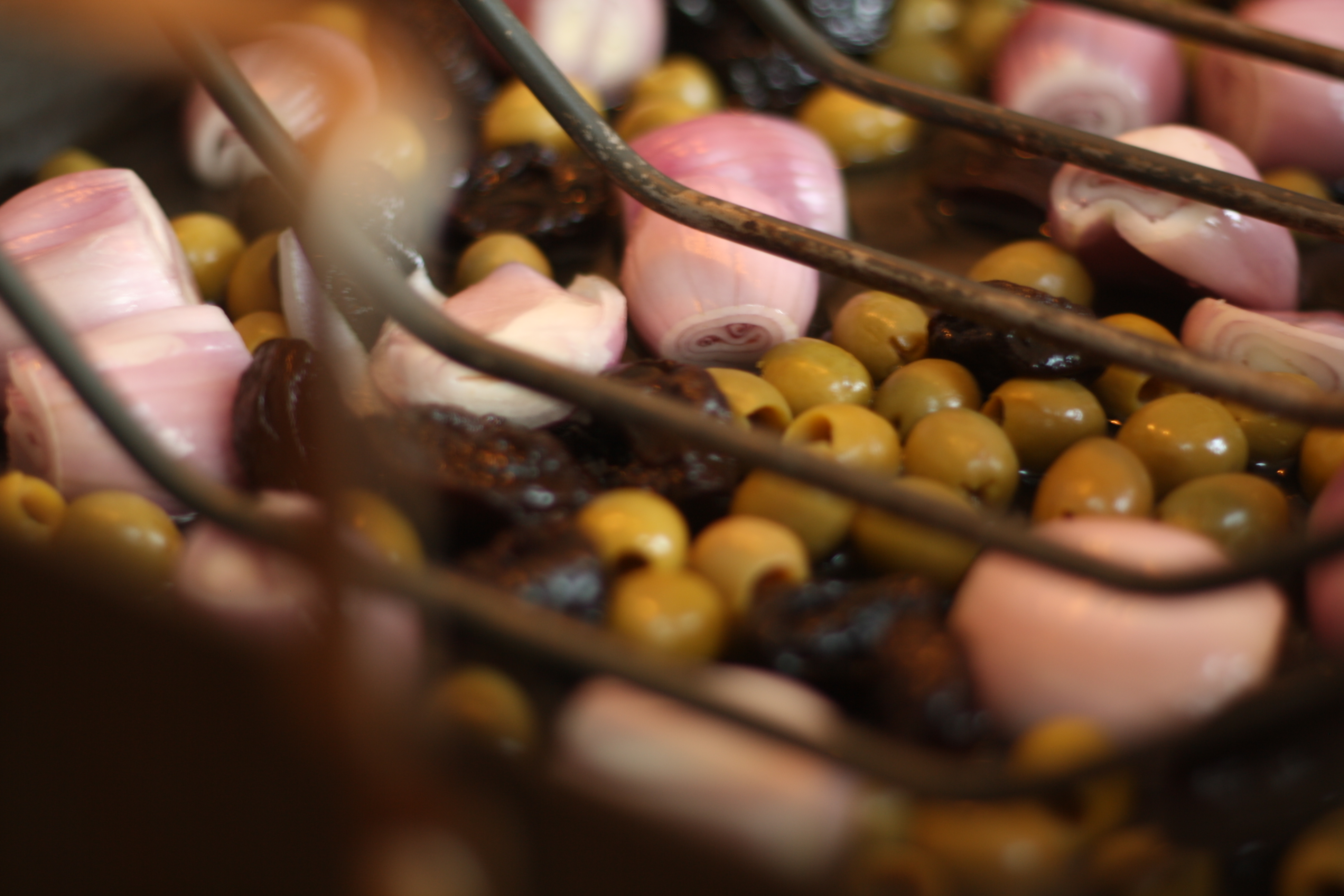 Setjið sósuna með ólífunum, sveskjunum og laukunum á fat. Sneiðið kjötið niður og leggið ofan á. Berið fram t.d. með ofnbökuðu rótargrænmeti.