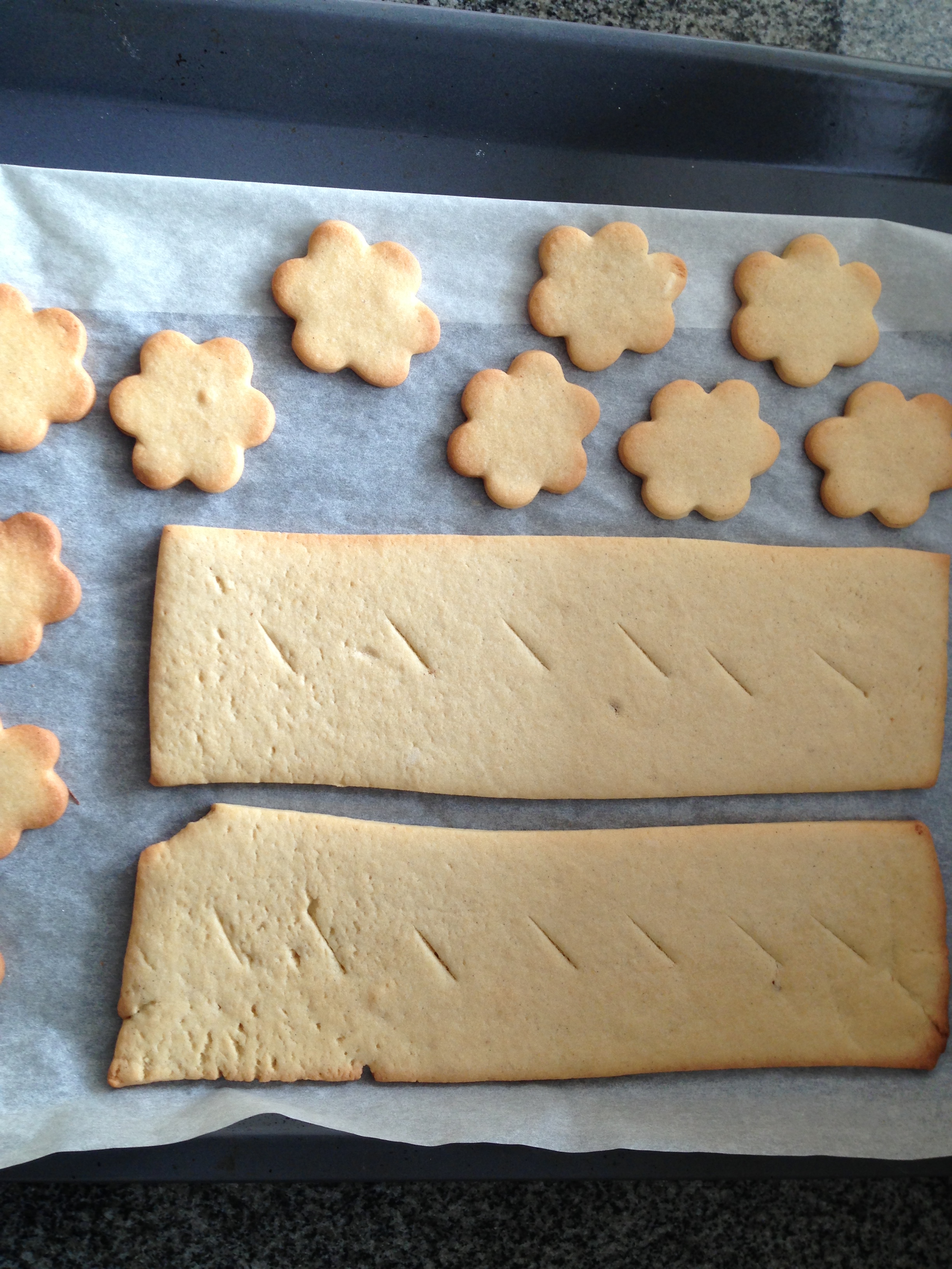 Rúllið því svo út í tvö aflöng stykki sem eru jafnstór. Snyrtið kantana til og skerið langsum eftir stykkjunum þannig að þið hafið nú fjögur stykki jafnstór. Bakað við 200°C í ca 10-12 mín. Passið að baka ekki of lengi – kökurnar eiga ekki að dökkna. Þegar kökurnar eru tilbúnar kælið þær í ca 15 mín.