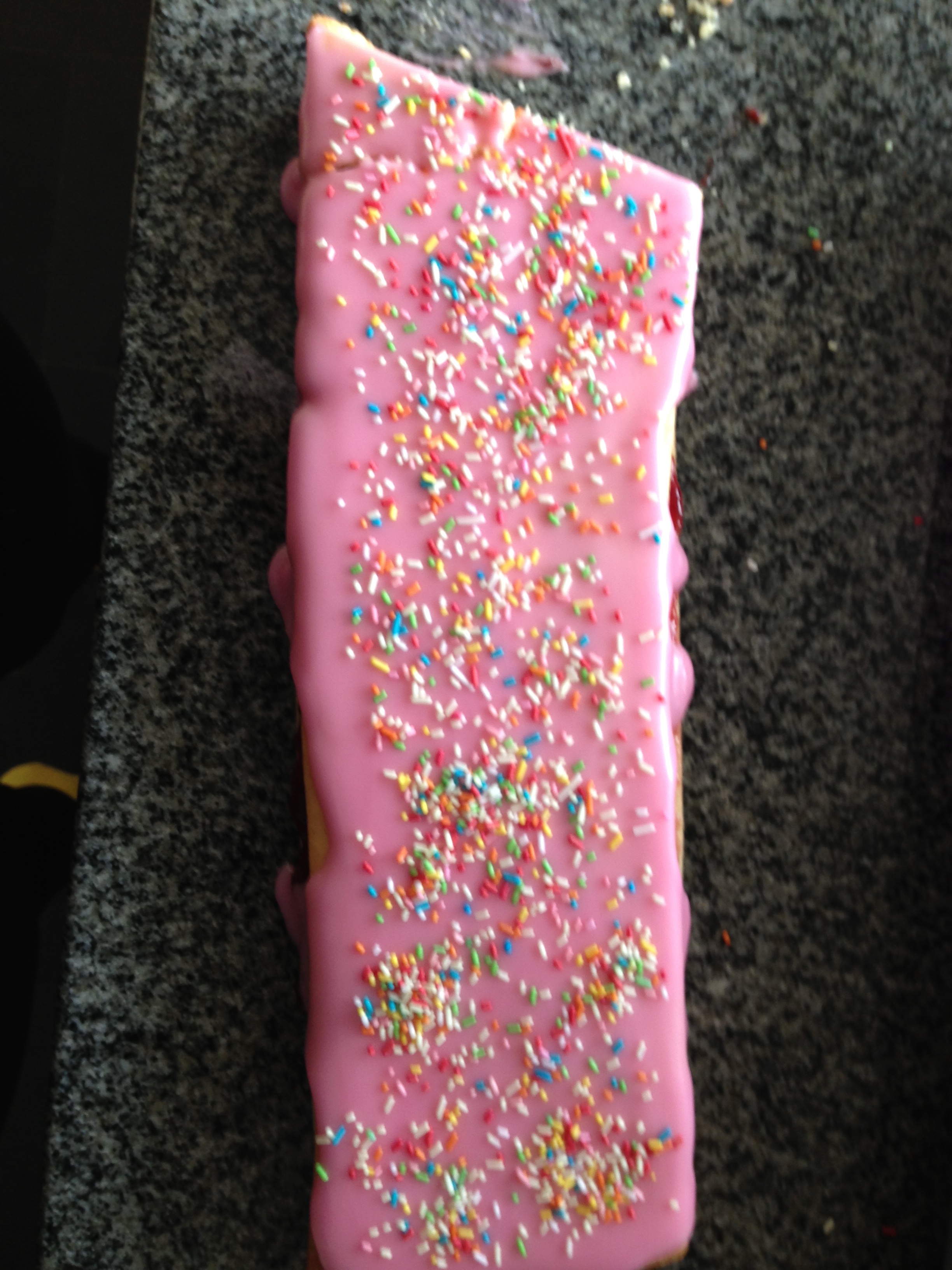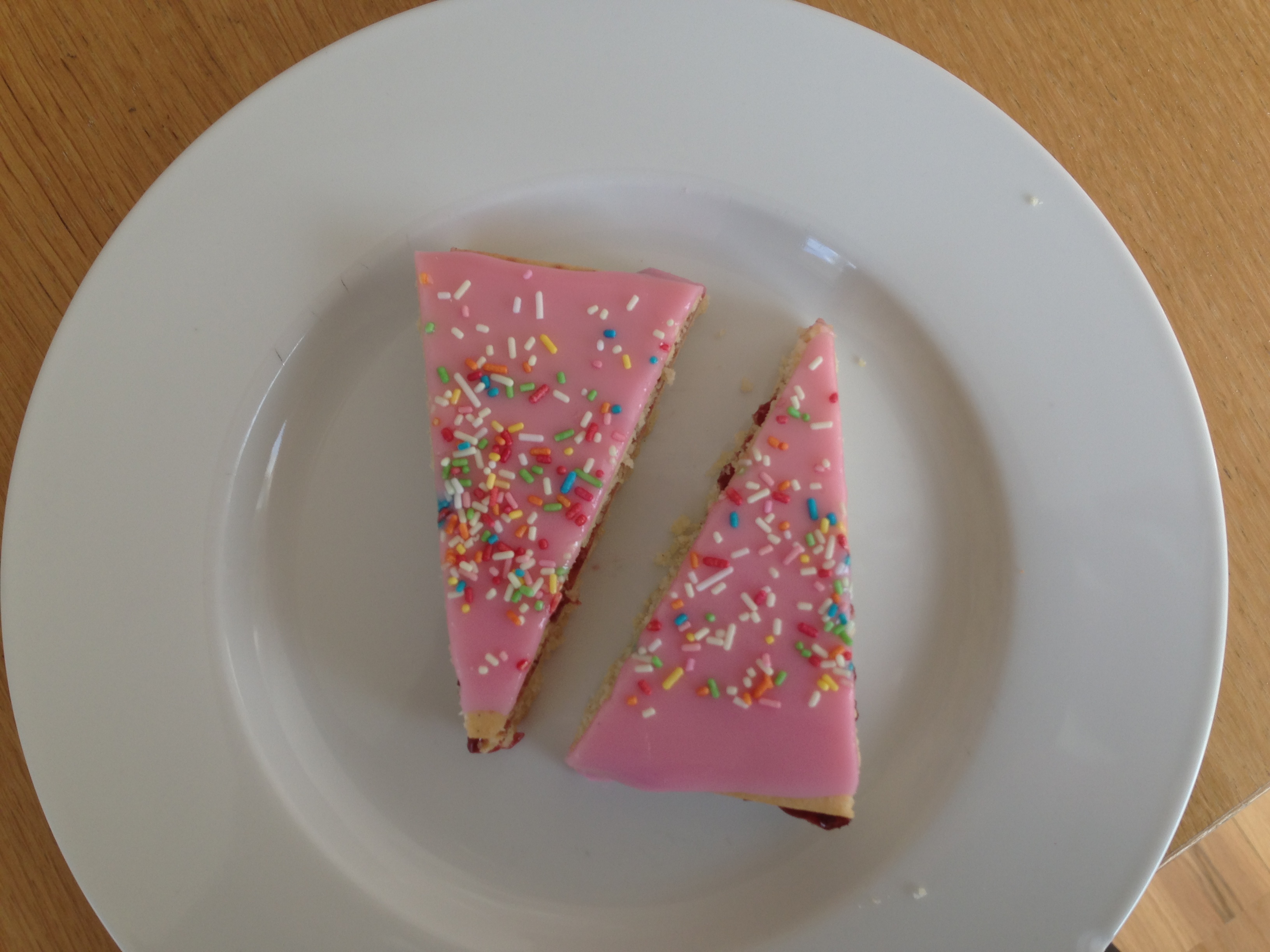 Smyrjið tvær lengjur með hindberjasultu/-glassúr og leggið hinar ofan á. Búið til glassúr úr flórsykri og vatni og litið hann ef þið kjósið. Svo hellið þið glassúrnum ofan á lengjurnar og smyrjið úr honum þannig að hann þekji yfirborðið alveg. Stráið skrauti yfir.