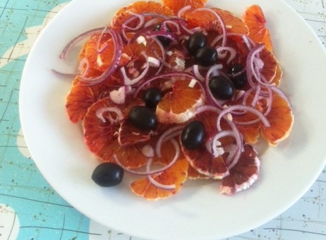 Þetta er einfalt, appelsínusneiðum er raðað á disk, lauk og ólífum stráð yfir. Sjúklega gott.