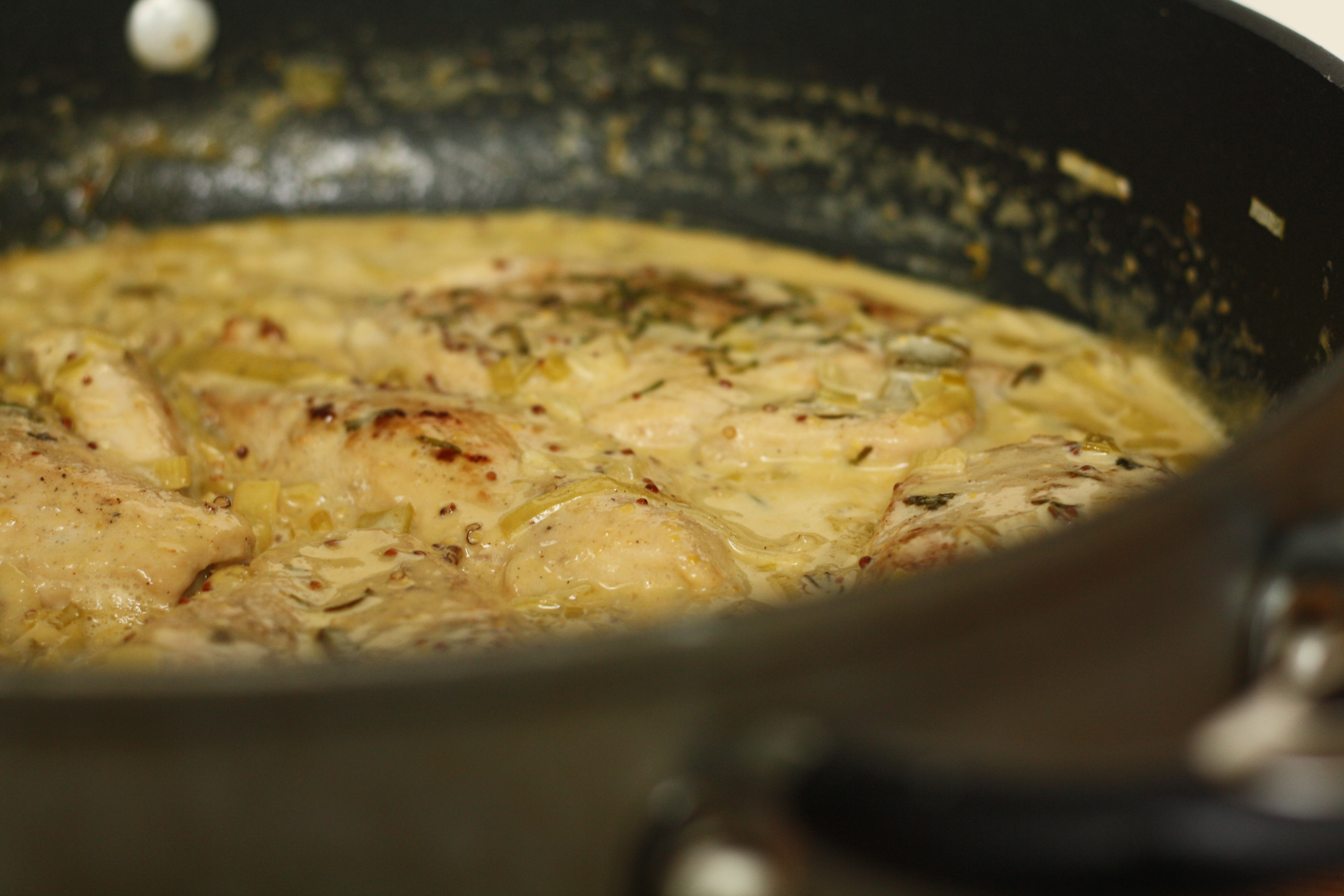 Hitið um 1 msk olíu og 1 msk smjör á pönnu. Brúnið kjúklingsneiðarnar í 3-4 mínútur á hvorri hlið. Takið af pönnunni og geymið. Sejið saxaða hvítlaukinn og púrrulaukinn á pönnunna og mýkið í nokkrar mínútur. Hellið þá hvítvíninu út á sjóðið niður um ca helming. Bætið rjómanum út á ásamt sinnepinu og látið malla í nokkrar mínútur. Setjið þá kjúklinginn aftur á pönnuna og látið malla þar til að sósan fer að þykkna og kjúklingurinn er orðinn heitur í gegn.