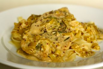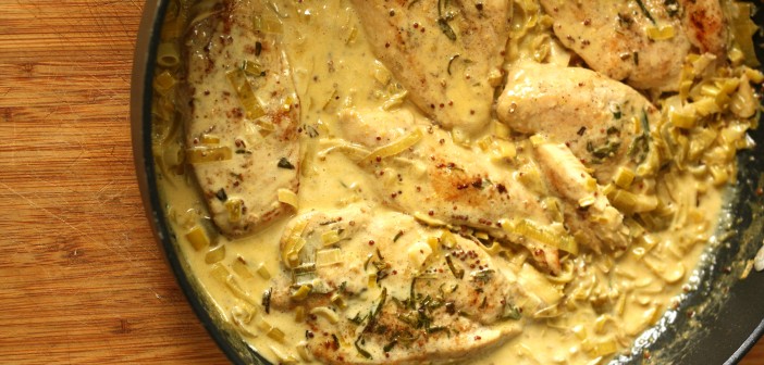 Franska matargerðin ræður ferðinni í þessari uppskrift þar sem að við eldum kjúklingabringur í rjómasinnepssósu ásamt púrrulauk.