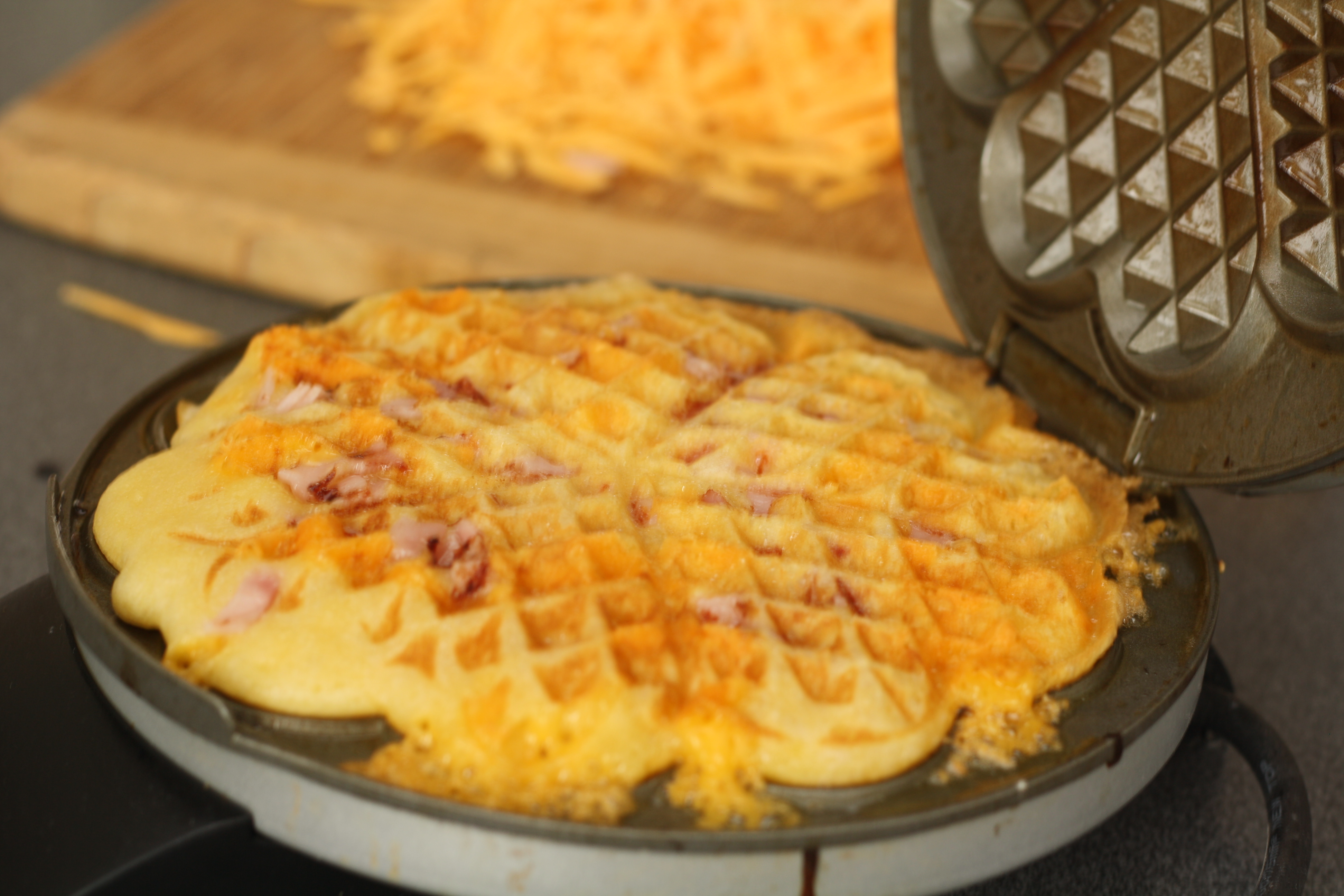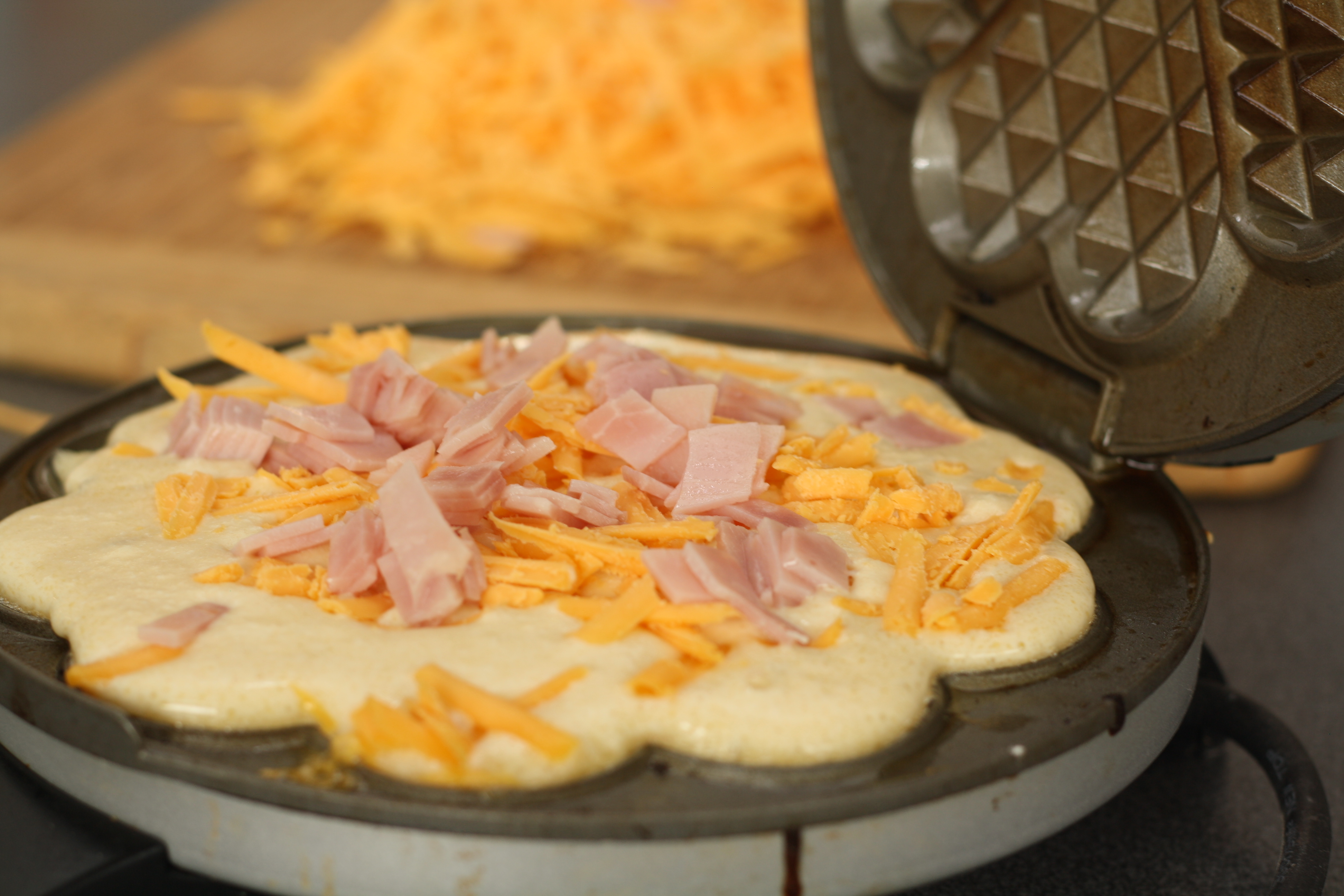 Blandið þurrefnunum saman. Blandið saman eggjarauðunum, kælda smjörinu, matreiðslurjóma og vatni. Blandið síðan þurrefnunum út í. Stífþeytið eggjahvíturnar og blandið þeim varlega saman við deigið. Setjið deigið á vöfflujárnið, síðan ostinn og skinkuna.