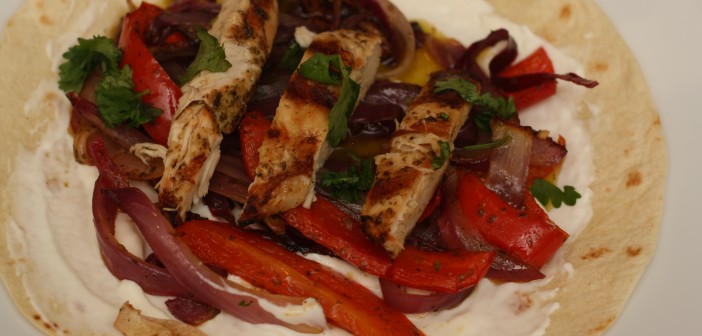 Þessi kjúklingavefja er algjört lostæti með grillaða grænmetinu og kóríander-limesósunni sem fylgdi með.