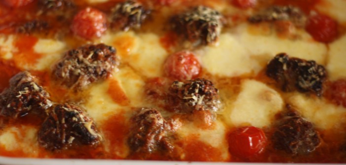 Klassísku kjötbollurnar eru hér settar í nýjan búning og eldaðar í ofni með mozzarellakúlum og kirsuberjatómötum.