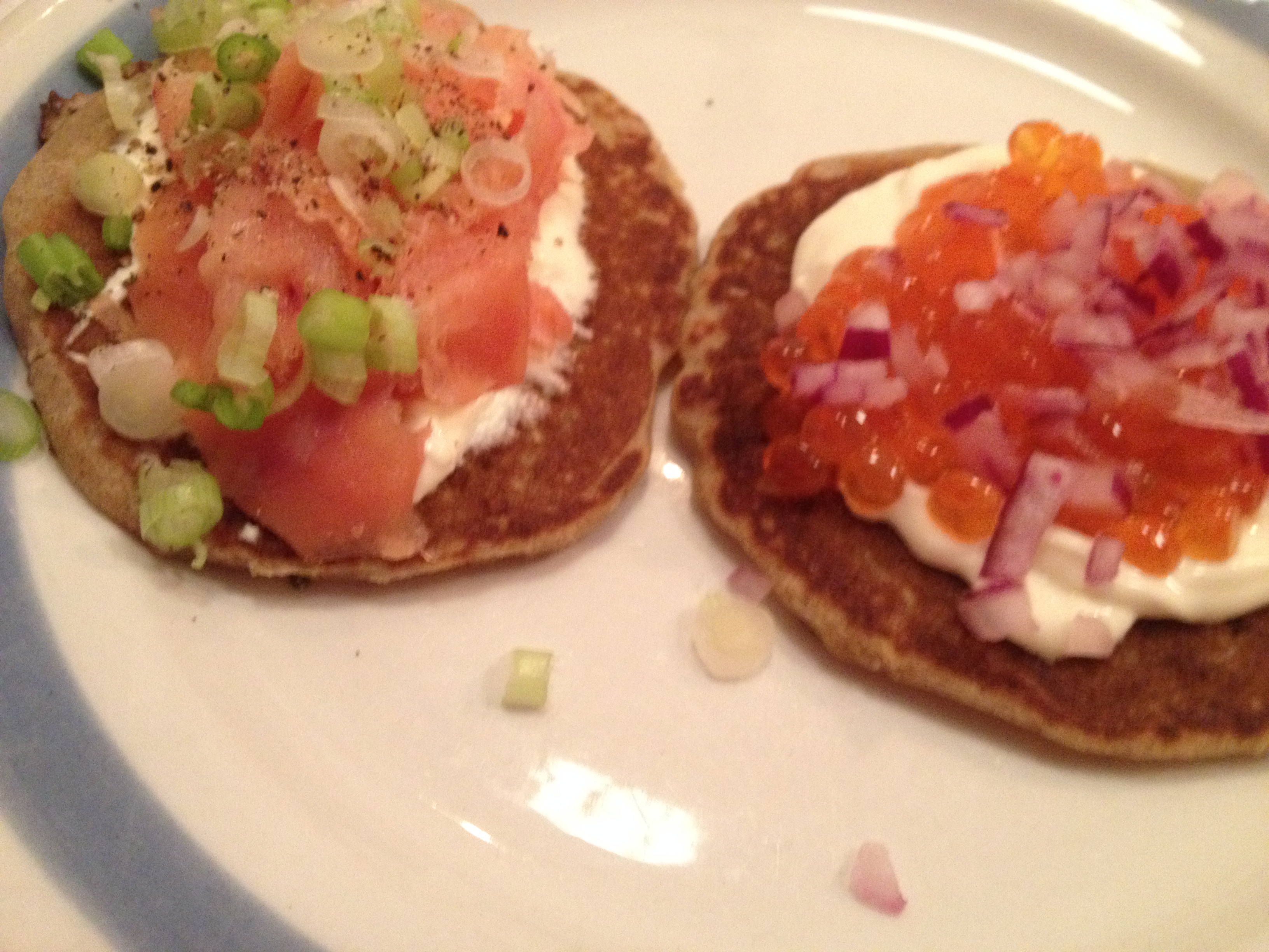 Á myndinni má sjá tvenns konar blini: Með sýrðum rjóma, laxahrognum og söxuðum rauðlauk. Hitt með sýrðum rjóma sem sítrónusafi var hrærður út í, taðreyktum laxi og söxuðum vorlauk.