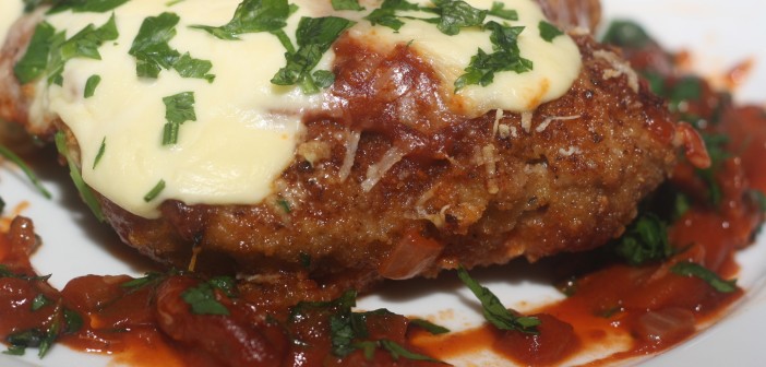 Kálfasneiðar í parmesan er útgáfa ítalsk-ameríska eldhússins af Scaloppini Milanese og kölluð „veal parmesan“ þar vestra. Þunnar kálfasneiðar (snitsel) í raspi með tómatasósu en ólíkt Ítölunum sem bera tómatasósuna fram með sneiðunum og pasta þá eru þær hér bakaðar með sósunni og osti.