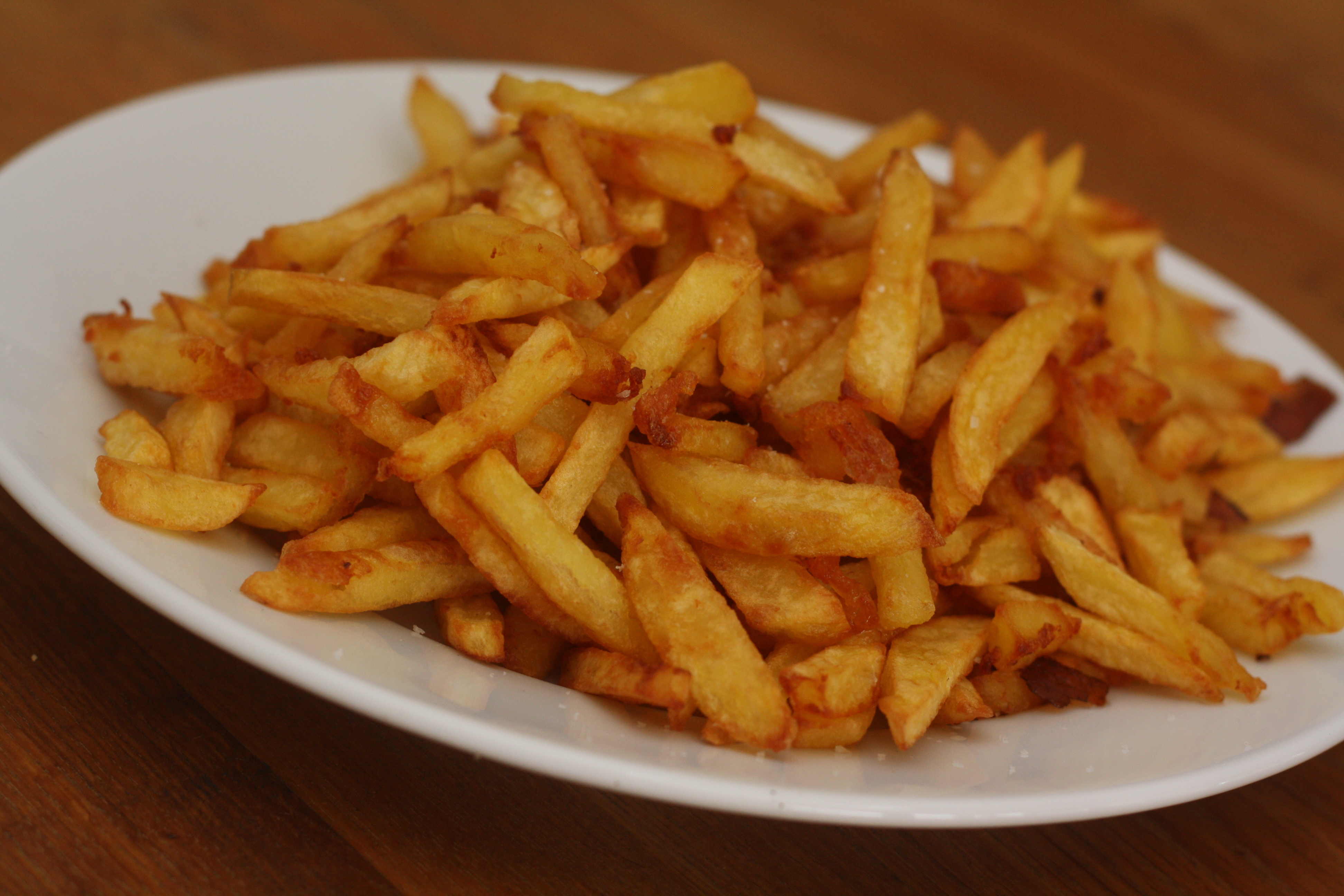 Það er hægt að gera alveg fullkomnar franskar heima hjá sér og til þess þarf engan djúpsteikingarpott. Galdurinn er að láta frönskurnar liggja fyrir í vatni áður en þær eru steiktar og að tvísteikja þær.