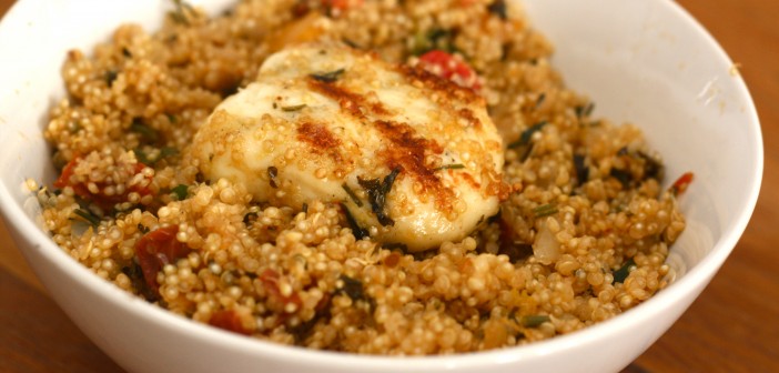 Í þessari uppskrift pörum við grillaðan Halloumi með góðu Quinoa-salati – öðru hráefni sem hefur notið mikilla vinsælda fyrir heilnæmi. Það má skipta út Quinoa fyrir t.d. búlgur (eða hvers vegna ekki farró?) en hugið þá að breyttum eldunartíma.