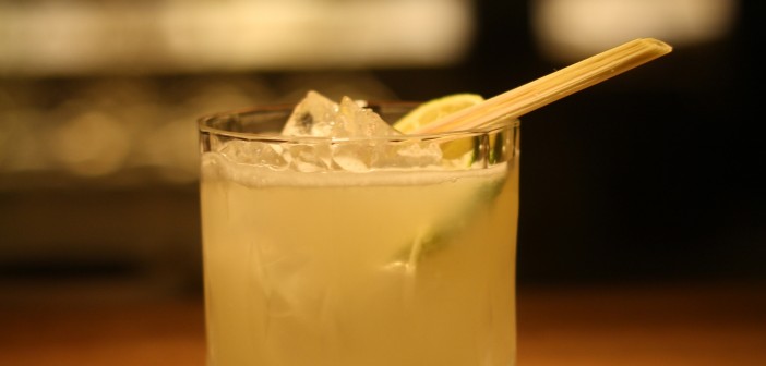 Allt hrist saman með klaka, síað og borið fram á klaka með limesneið.