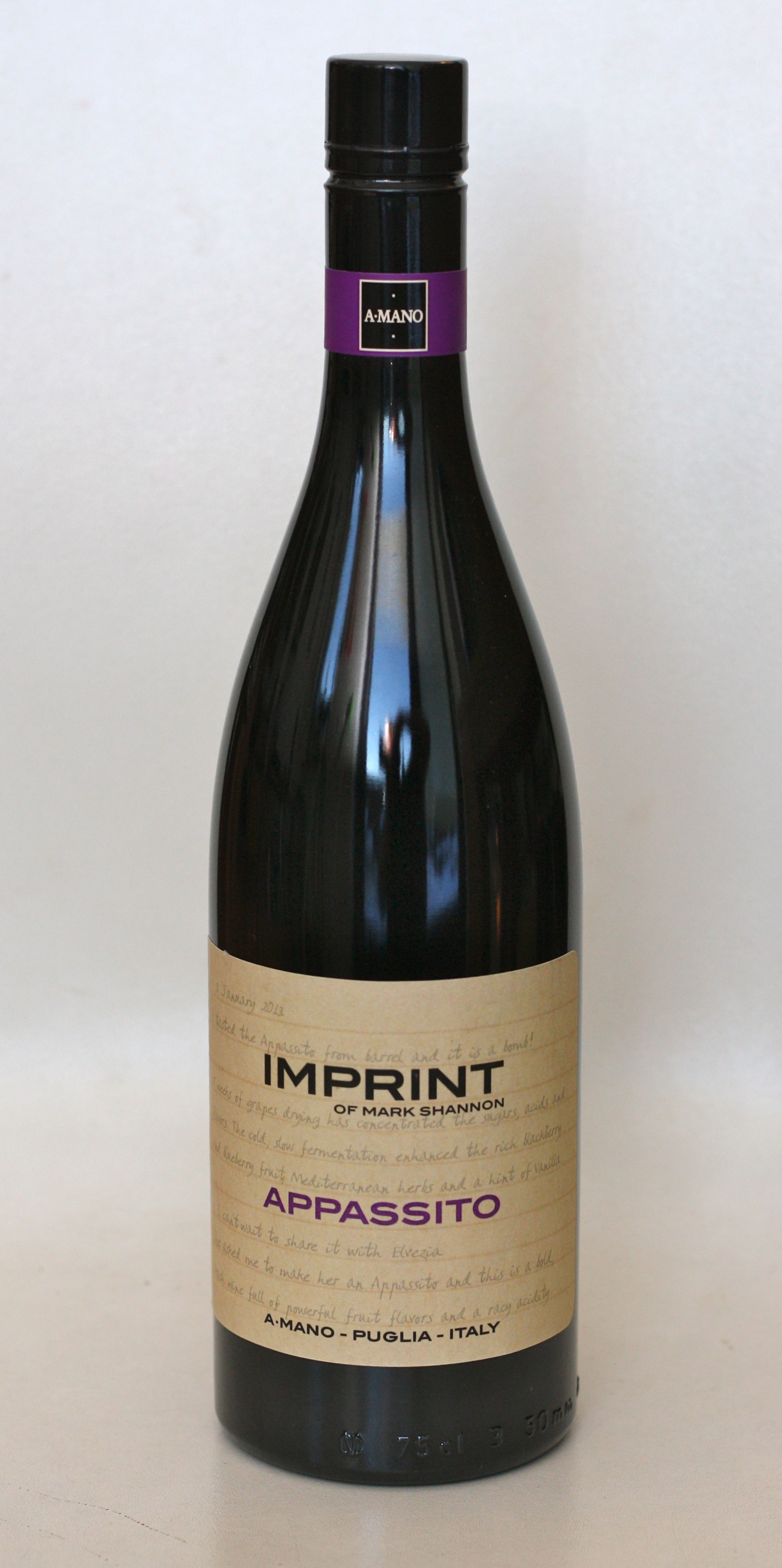 Apassito er tækni við víngerð sem er yfirleitt tengd við Veneto en slík vín má þó einnig finna frá fleiri svæðum. Imprint er rauðvín frá Púglía syðst á Ítalíu og er eitt af vínunum sem þau Mark og Elvira hjá A Mano hafa sett á markað. Auðvitað er loftslagið annað í suðrinu en í norðurhluta Ítalíu og þrúgan sem er notuð er Primitivo, þrúgurnar þurrkaðar að hluta áður en víngerðin sjálf hefst til að ná fram meiri krafti.