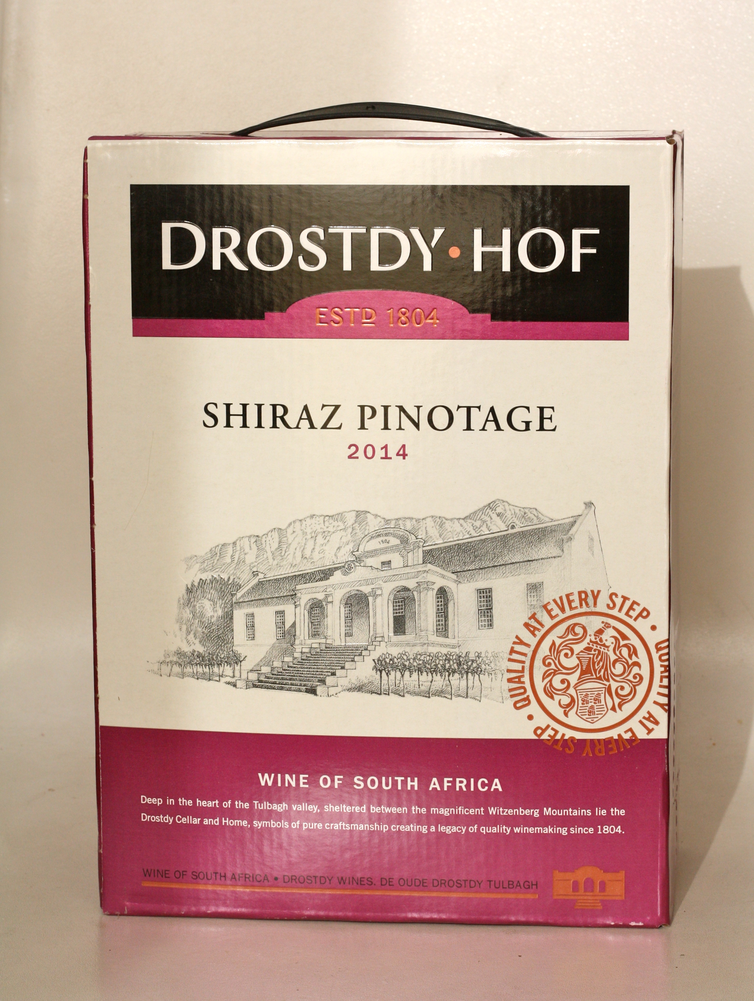 Suður-afrísku vínin frá Drostdy Hof hafa notið mikilla vinsælda, ekki síst í þriggja lítra kössum og kassavín frá fyrirtækinu hefur til að mynda verið valið besta kassavínið á markaðnum af sænskum víntímaritum. Heitur og kryddaður ávöxtur, svolítið bjart og lifandi, krækiber og rifsber, plómur. Mjúkt og kryddað í munni, töluverð jörð og reykur.