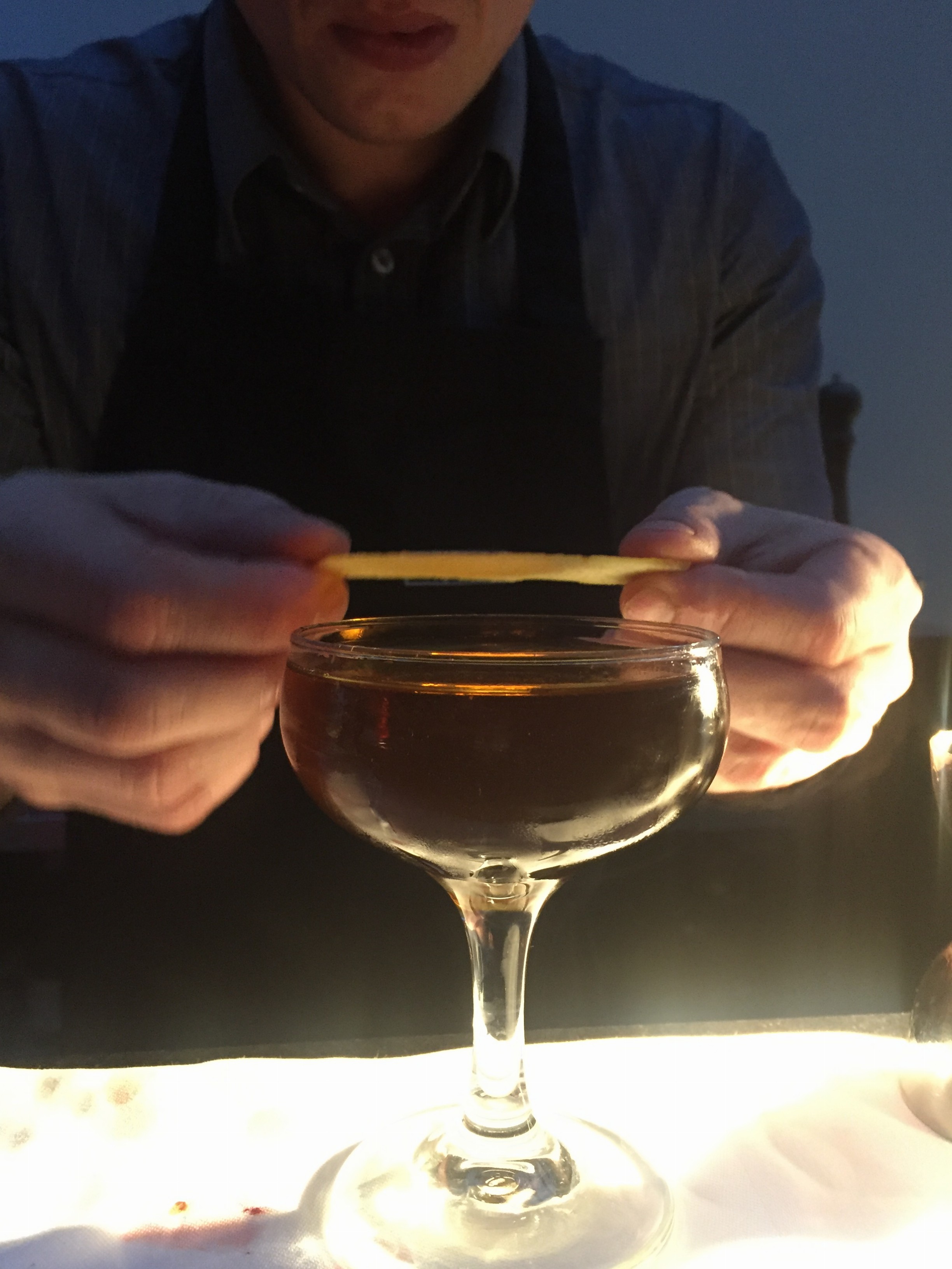 Hrærið ásamt klaka. Síið í Manhattan-glas. Skerið smá sneið af sítrónuberki. Nuddið glasröndina með berkinum og leggið loks ofan á glasið.