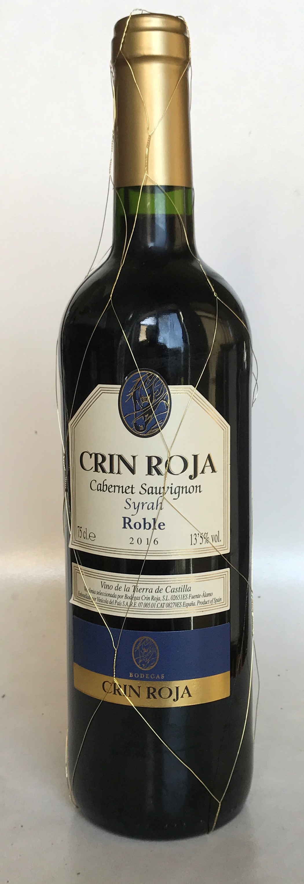 Crin Roja er vínhús í Castilla-La Mancha upp á hásléttunni í hjarta Spánar. Vínin þaðan eru ódýr en yfirleitt ágætlega gerð miðað við verð eins og þetta rauðvín úr frönsku þrúgunum Cabernet Sauvignon og Syrah. Það er ungt eins og rauðfjólublár liturinn ber með sér, angan berjamikil, bláber og sólber, örlítið kryddað, eikin mjög mild og væg, í munni nokkuð bjartur og hreinn berjasafi, tannískt. Prýðilegasta matarvín.