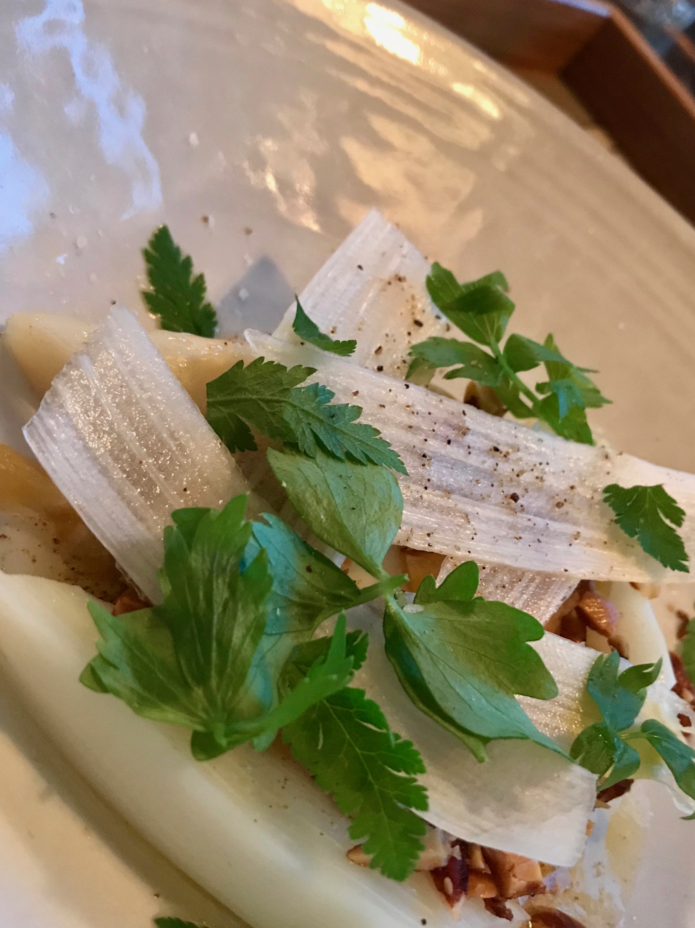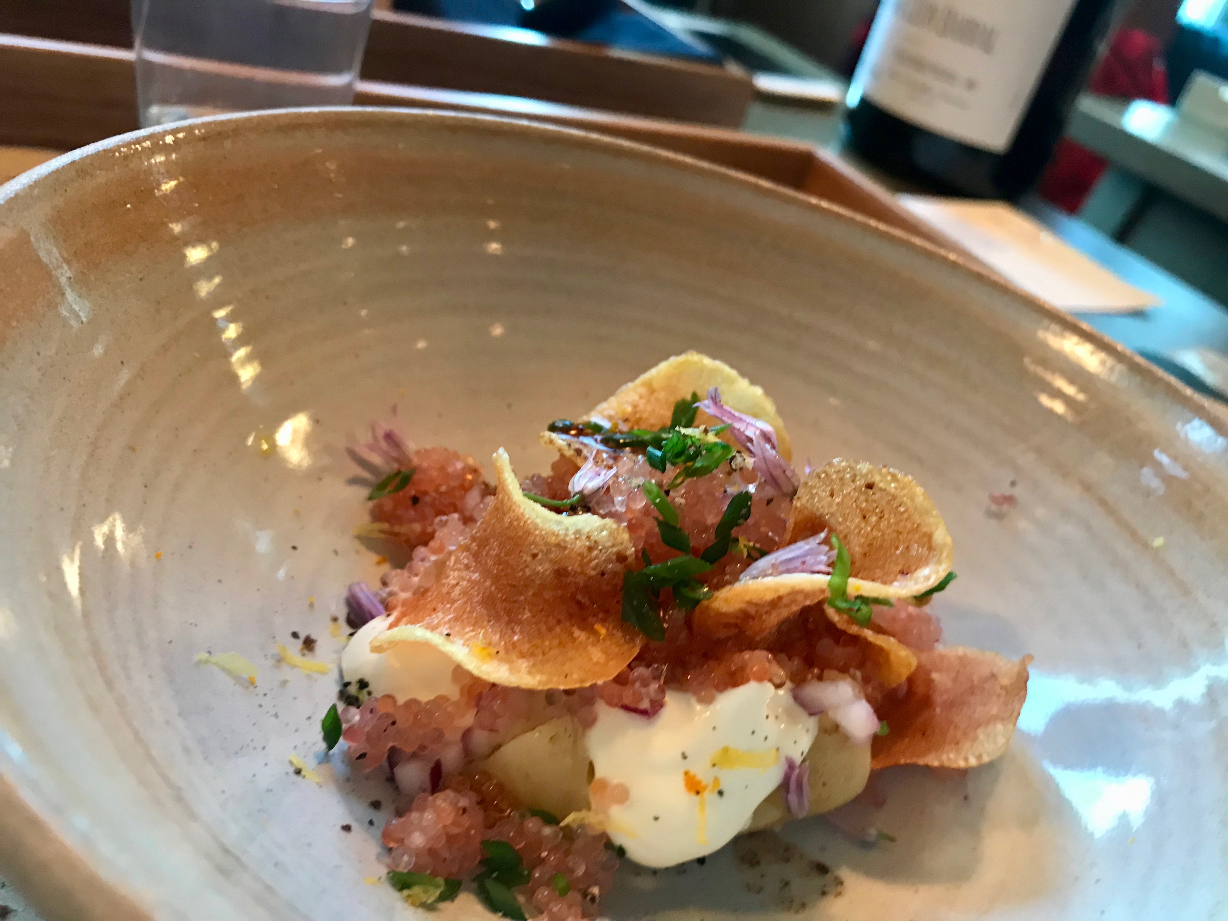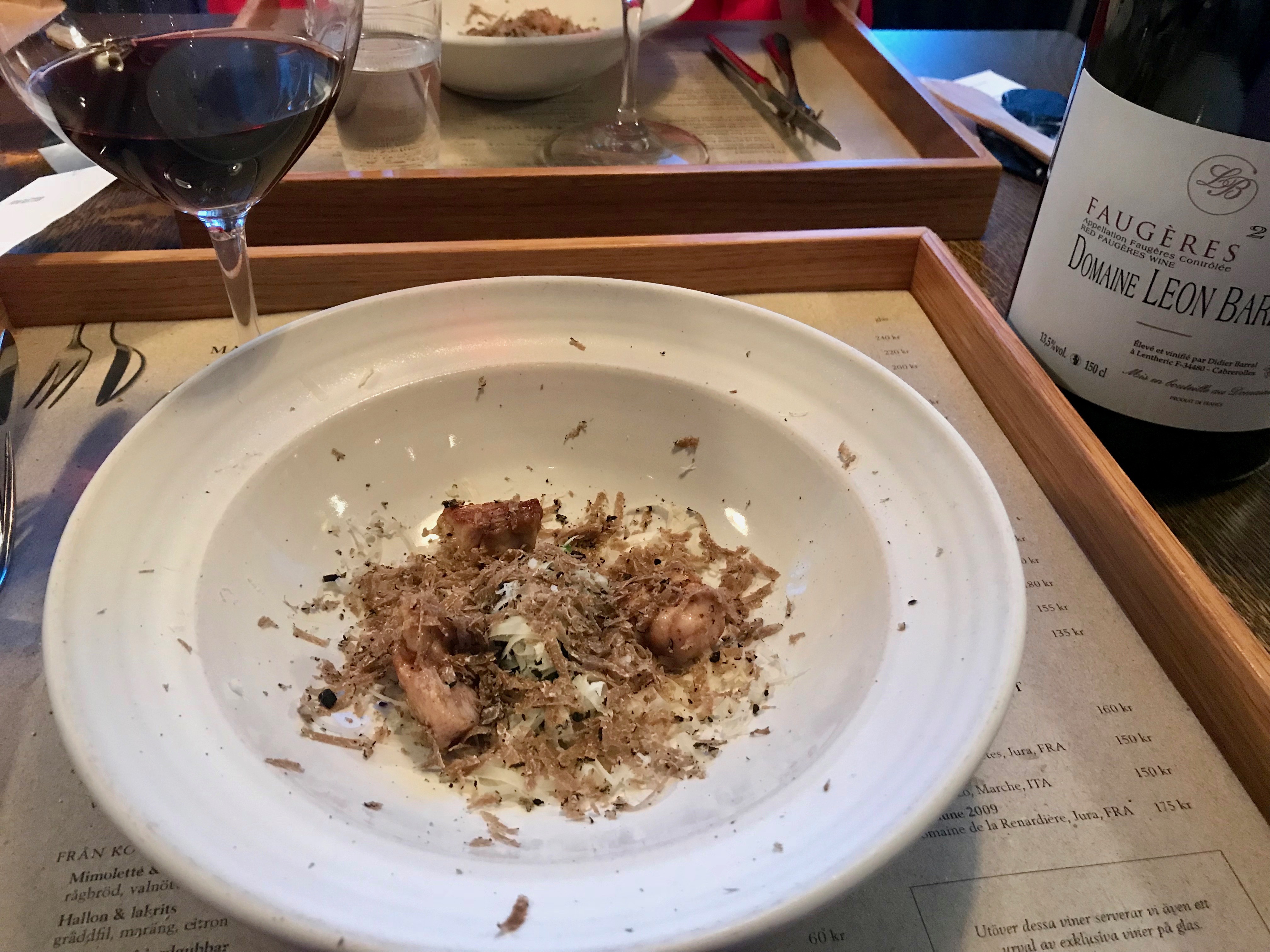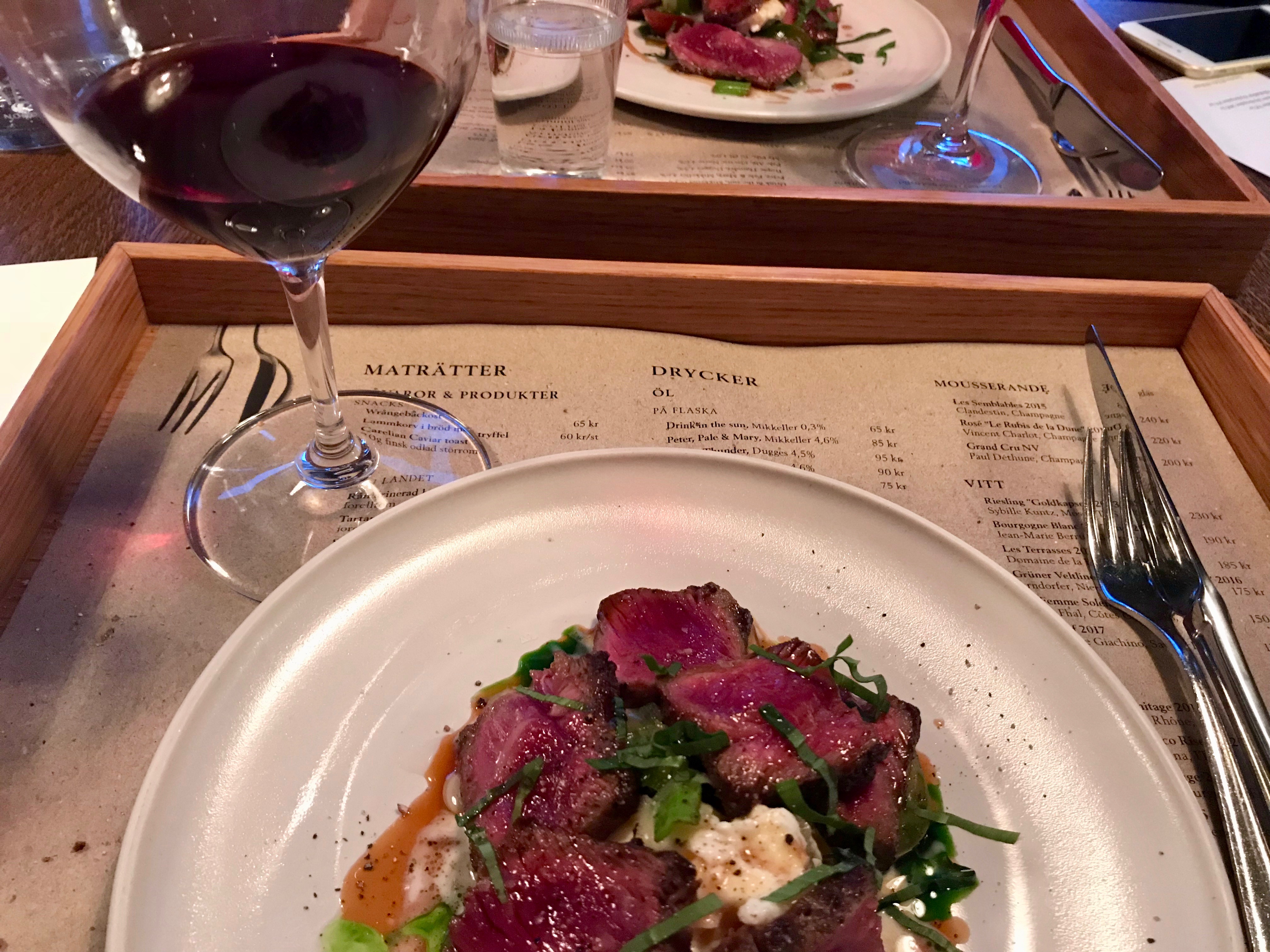Hinum megin við ganginn er svo Matbaren, sem var áður óformlegri útgáfa af stjörnustaðnum, Fallegur sallaður hannaður af Ilse Crawford þar sem Dahlgren hefur einnig unnið að því að breyta ríkjandi straumum. Áherslan er á minni rétti og gestir hvattir til þess að vera ekkert endilega að panta alla í einu. Byrja bara á einum og bæta síðan fleirum við eftir því sem matarlystin leyfir. Þótt réttirnir séu flestir einfaldir leynir sér ekki handbragðið og sköpunargáfan sem ávallt hefur einkennt matargerði Dahlgrens og maður hefur fengið að njóta af allt frá því að hann var á Fredsgatan 12 og síðan Bon Lloc. Það