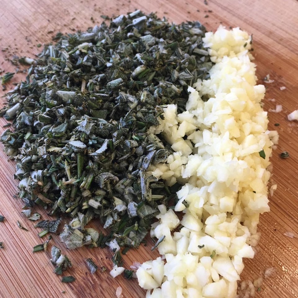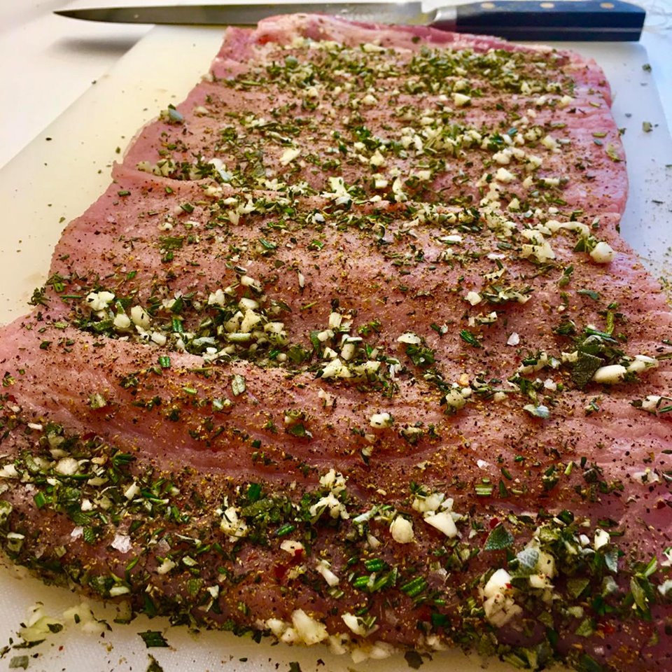 Dreifið jafnt yfir allan kjötflötinn, saxaða hvítlauknum, söxuðu kryddjurtunum, pipar, chiliflögum og kryddið hefðbundið með salti. Klappið þessu aðeins á kjötið til að loði við. Það má sjá til hliðar á mynd, það á að vera mikið af hvítlauk og kryddjurtum á kjötinu.