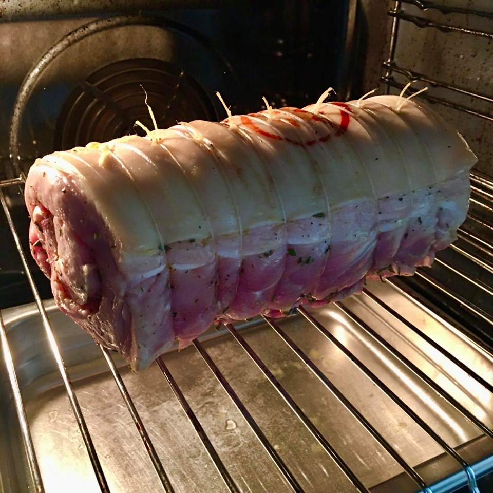 Komið kjötrúllunni fyrir á rist og inn í ofn við 160-170 graður. Undir kjötinu þarf að koma fyrir nægilega djúpum bakka með 1 ½ lítra af vatni. Bakið Porchetta-rúlluna á þessum hita í 2 klst.