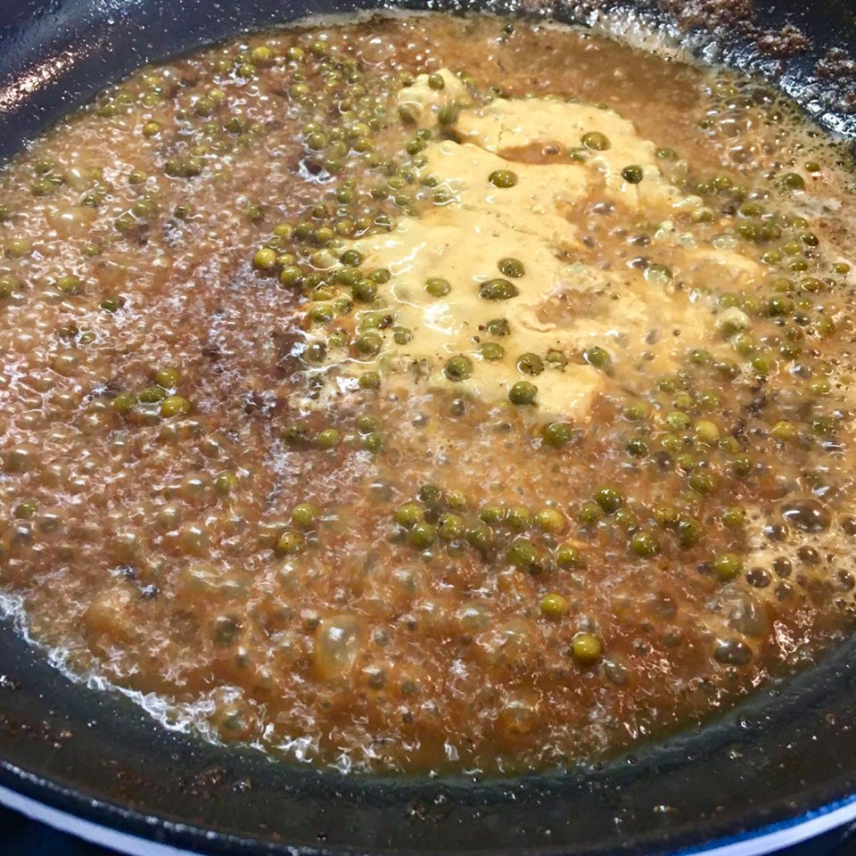 Bætið 2 msk sinnep og 2 msk grænpipar í legi út á pönnuna, á rúmlega miðlungs hita, dassið þá næst koníakinu á pönnuna og náið fljótt upp suðu.(þá er hægt að kveikja í víninu ef svo ber undir, og einnig hægt að sleppa því) Bætið mjög fljótlega við rjómanum og náið aftur upp suðu, notið lítin pískara til að hræra saman sósuna. Húna þarf að sjóða smá stund til að ná réttri þykkt. Þegar þetta er komið takið pönnuna þá af aldavél eða slökkvið undir hita. Pískið saman við 2 msk af smjöri og smakkið sósuna til með salti og pipar.