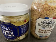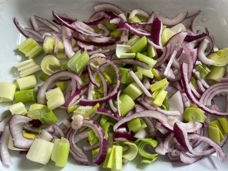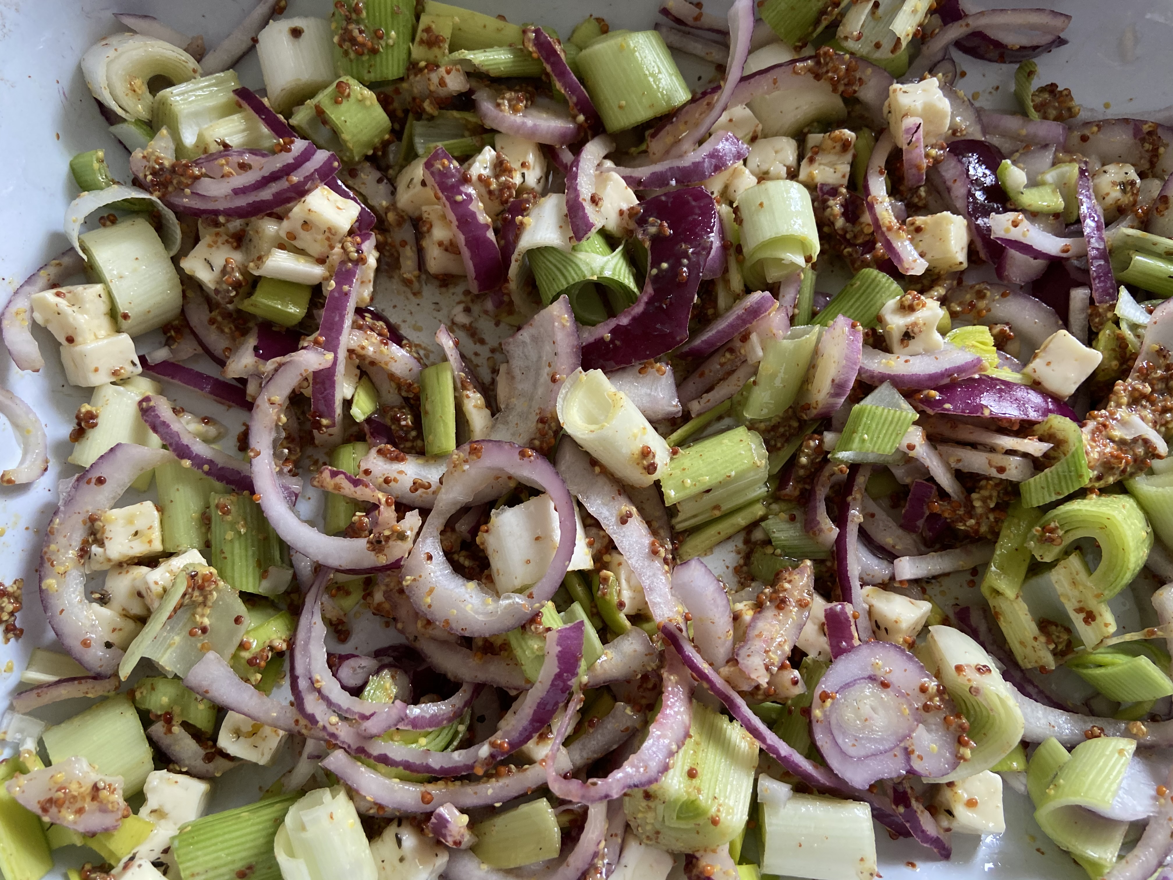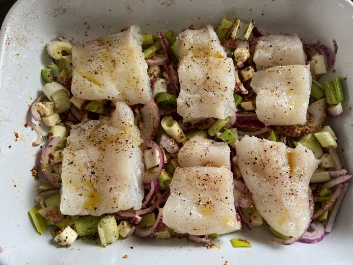Byrjið á því að skera niður púrrulauk og rauðlauk og setið í eldfast mót. Hellið fetaosti ásamt kryddlegi yfir, blandi saman við ásamt sinnepinu. Skerið fiskinn í bita og raðið ofan á. Hellið smá olífuolíu á fiskinn. Kreistið safa úr sítrónu yfir. Saltið og piprið.