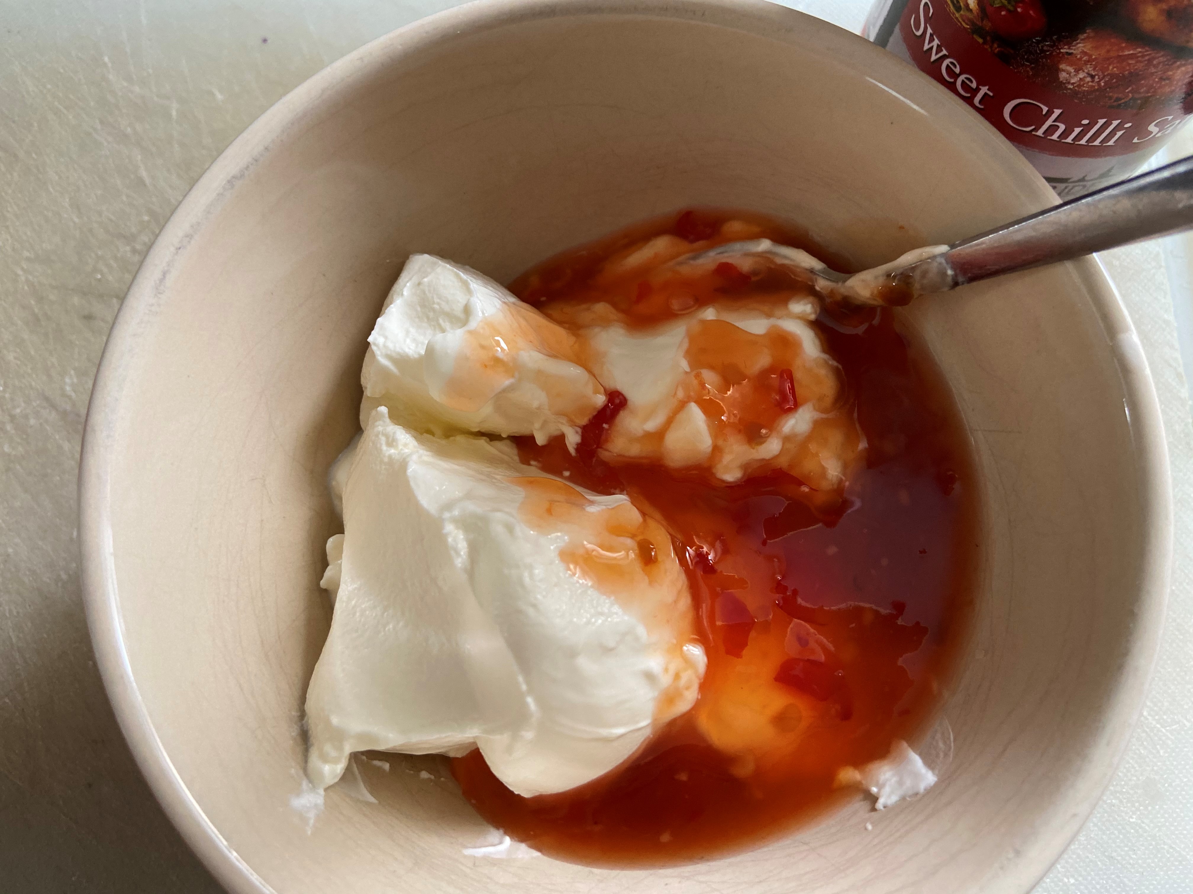 Með þessu er fínt að hafa ferskt salat, hrísgrjón og kalda sósu. Pískið saman sýrðan rjóma og Sweet Chili Sauce í hlutföllunum 1 af chilli-sósu á móti 3 af sýrðum rjóma.