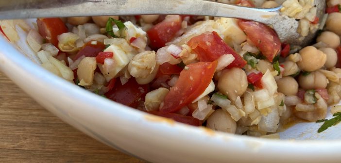 Kjúklingabaunir og tómatar eru grunnurinn í þessu ferska sumarsalati sem er tilvalið með grillmatnum. Salatið á vel við flestan grillmat, til dæmis kjúkling, lamb eða þess vegna grillaðan fisk