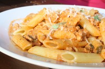 að eru fjórar tegundir af lauk notaðar í þessa pastauppskrift sem annars byggir á kjötsósu sem líkir eftir sósum þar sem klassískar ítalskar pylsur eru notaðar.