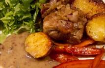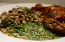 Það er margt á ferðinni hér. Kjúklingurinn tekur í sig bragðið úr kryddjurtunum og víninu og margs konar kryddjurtir koma við sögu í sósunni. Augnbaunirnar eða Black Eyed Peas kóróna síðan réttinn.