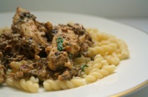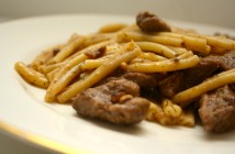 Það er ekki alltaf hægt að ganga að kálfakjöti vísu í kjötborðunum. En þegar það býðst er um að gera að stökkva á það. Hér eru kálfasneiðarnar eldaðar með furuhnetum og blandaðar saman við pasta.