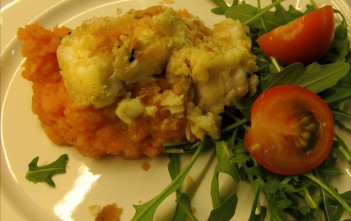 Sætar kartöflur fara einkar vel með sjávarfangi og hér er einfaldur tiltölulega fyrirhafnarlítill forréttur fyrir fjóra sem auðvelt er að breyta í aðalrétt með því að tvöfalda eða þrefalda uppskriftina.