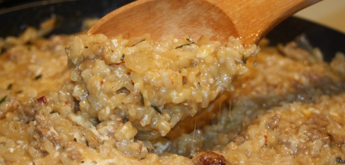 Risotto er yfirleitt eitthvað sem menn tengja við matargerð Norður-Ítalíu. Þessi uppskrift kemur hins vegar frá suðurhlutanum, nánar tiltekið frá Basilicata. Í upprunalegu uppskriftinni er gert ráð fyrir reyktum scamorza-osti sem er mjög áþekkur reyktum mozzarella. Þar sem slíkur ostur er ekki fáanlegur á Íslandi er best að nota óreyktan mozzarella. Þetta er jafngott fyrir það. Þá er gert ráð fyrir innvolsinu úr ítölskum pylsum en það er hægt að gera með lítilli fyrirhöfn – það væri aðeins meira mál ef við þyrftum að troða pylsugarnirnar.