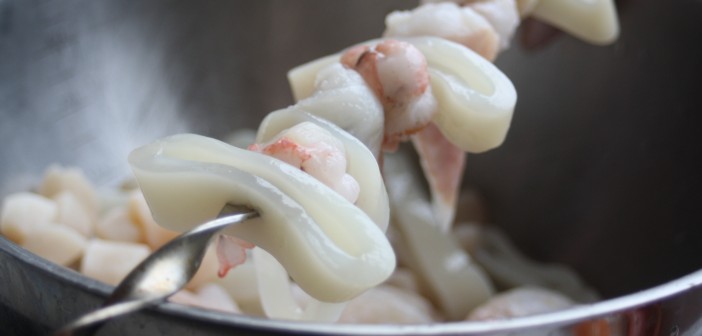 Skerið fiskinn í passlega stóra bita og þræðið á grilltein, og gætið að því að bitarnir séu nægjanlegaq stórir til að þola að vera á grillinu dálitla stund, en það er rétt að hafa í huga að smokkfiskinn – sem er þverskorinn í ca. 0,5 cm. breiða hringi – þarf að grilla í hæfilegan tíma, hann má hvorki vera of hrár né of þurr. Sama gildir auðvitað um humarinn, hörpuskelina og skötuselinn.