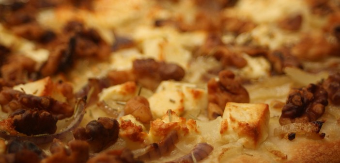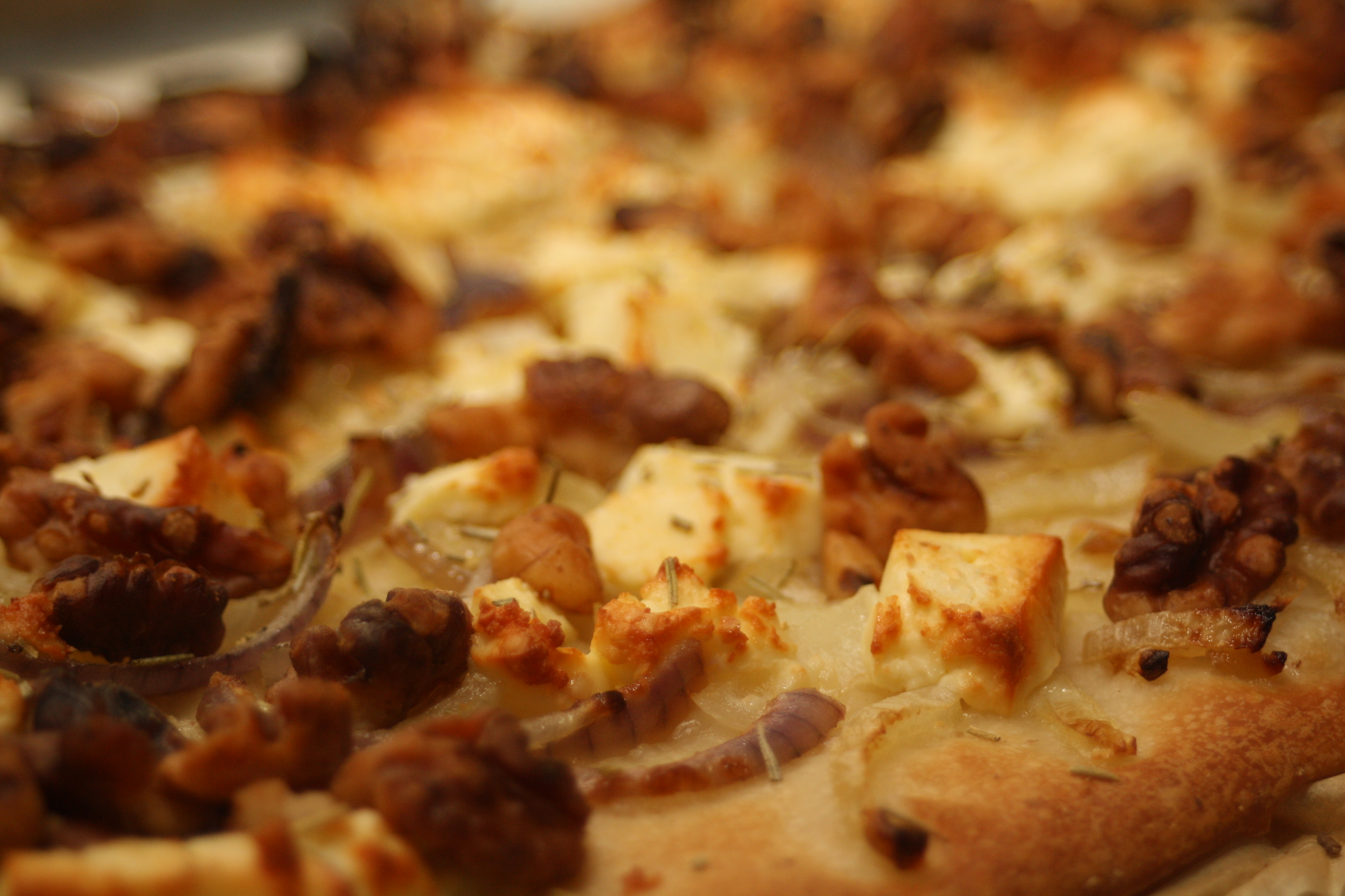 Mýkið laukinn í ólívuolíu á miðlungs hita á pönnu í 8-10 mínútur. Dreifið honum um pizzubotninn. Myljið valhnetur yfir og sáldrið fetaosti og rósmarín yfir botninn. Bakið.