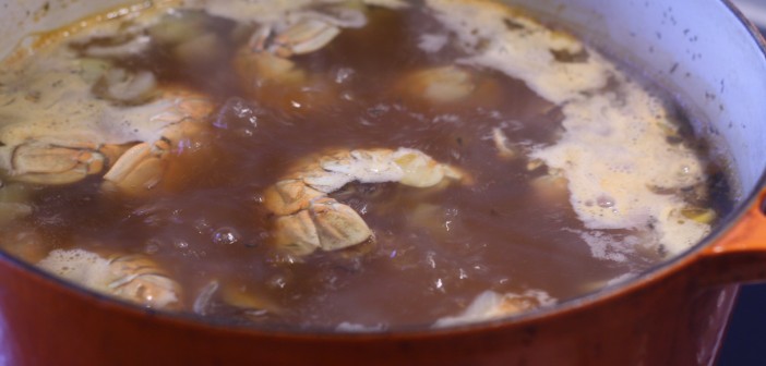 Hitið smjörið í þykkum potti. Byrjið á því að steikja grænmetið í 4-5 mínútur. Bætið þá humarskeljunum saman við og brúnið þar til þær taka á sig lit. Þá er kryddunum og tómatapúrrunnu bætt saman við ásamt um 2 lítrum að vatni. Leyfið suðunni að koma upp og lækkið þá hitann og látið malla. Vökvann þarf að sjóða niður um ca 3/4 –  4/5. Bragðið á því eftir um klukkutíma og metið hvort að það sé orðið nógu bragðmikið. Þegar þið eruð ánægð er slökkt á hitanum. Gott er að láta soðið standa í pottinum í hálftíma, klukkutíma í viðbót til að draga í sig aukið bragð áður en það er síað.