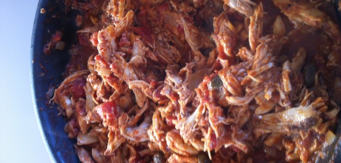 Ég hef oft gert kjúkling í ýmsum tegundum af „mole“ (sem þýðir sósa þarna í heiminum) en þær uppskriftir hafa ekki valdið vonbrigðum en eru afskaplega tímafrekar þar sem þurrrista þarf flest innihald, blanda svo saman og mauka í restina. Ég ákvað því í græðgiskasti á laugardegi að gera einfalda útgáfu af þessu, og ég var spennt fyrir þessu því hægt er að elda þetta í tvennur lagi.  Ég er mjög hrifin af mat sem maður getur eldað í tvennu lagi, þ.e.a.s. byrjað og gert eitthvað smá, rokið svo í burtu og keypt ryksugupoka, og svo komið tilbaka og klárað.  Þessi uppskrift er svoleiðis en við sjóðum kjúkling (poach) sem gerir hann góðan og djúsí og svo gerum við sósuna sem við bætum svo tættum kjúkling út í.