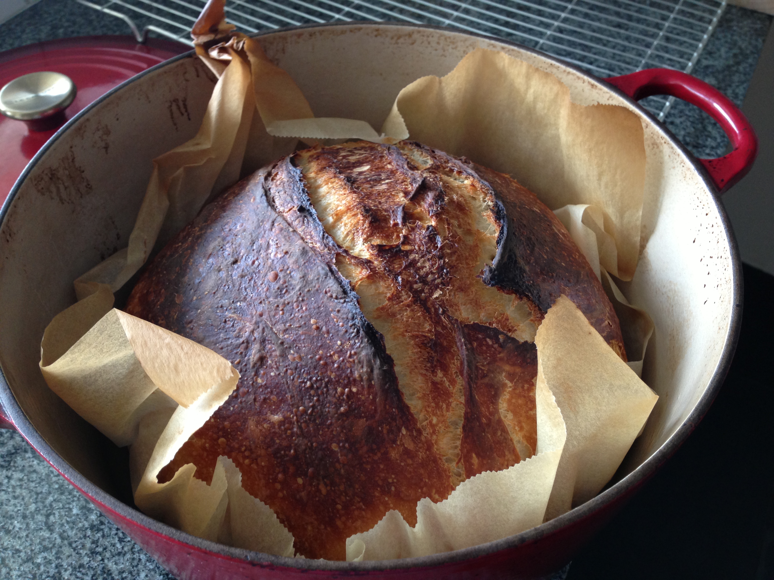 Til að fá góða fallega skorpu á brauðið þá baka ég það í steypujárnspotti sem ég hef inni í ofninum á meðan hann er að hitna. Þegar ofninn er orðinn nógu góður þá tek ég pottinn út og set bökunarpappírinn með deiginu og skelli ofan í pottinn – lokið á og inn í ofn í ca 30 mínútur. Þá er lokið tekið af pottinum og brauðið bakað áfram í ca 10-15 mín. Passið ykkur þegar þið takið pottinn út hann er sjóðandi heitur.