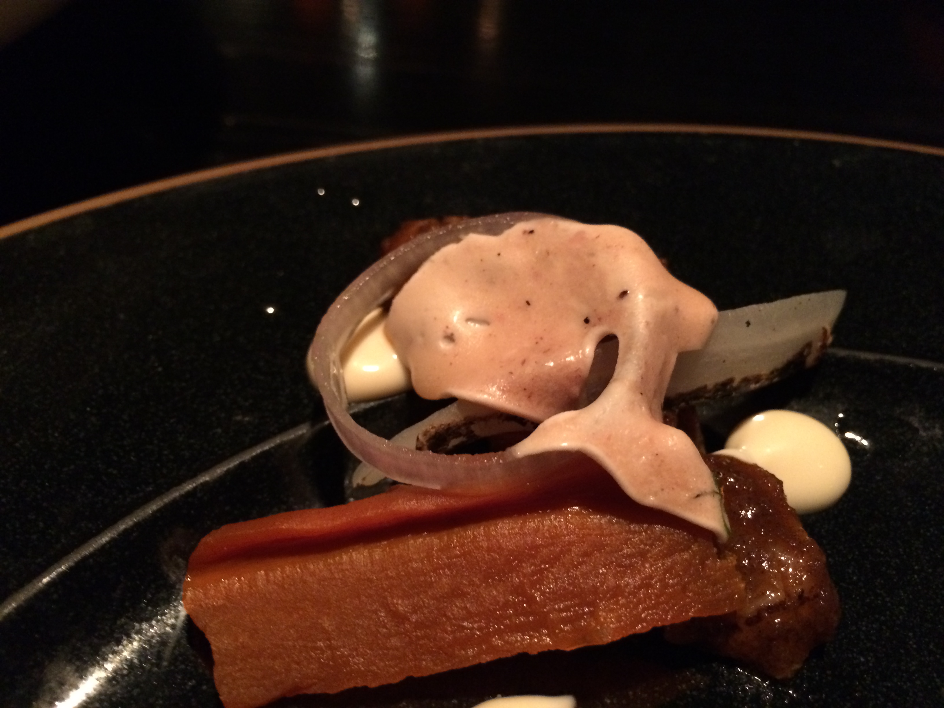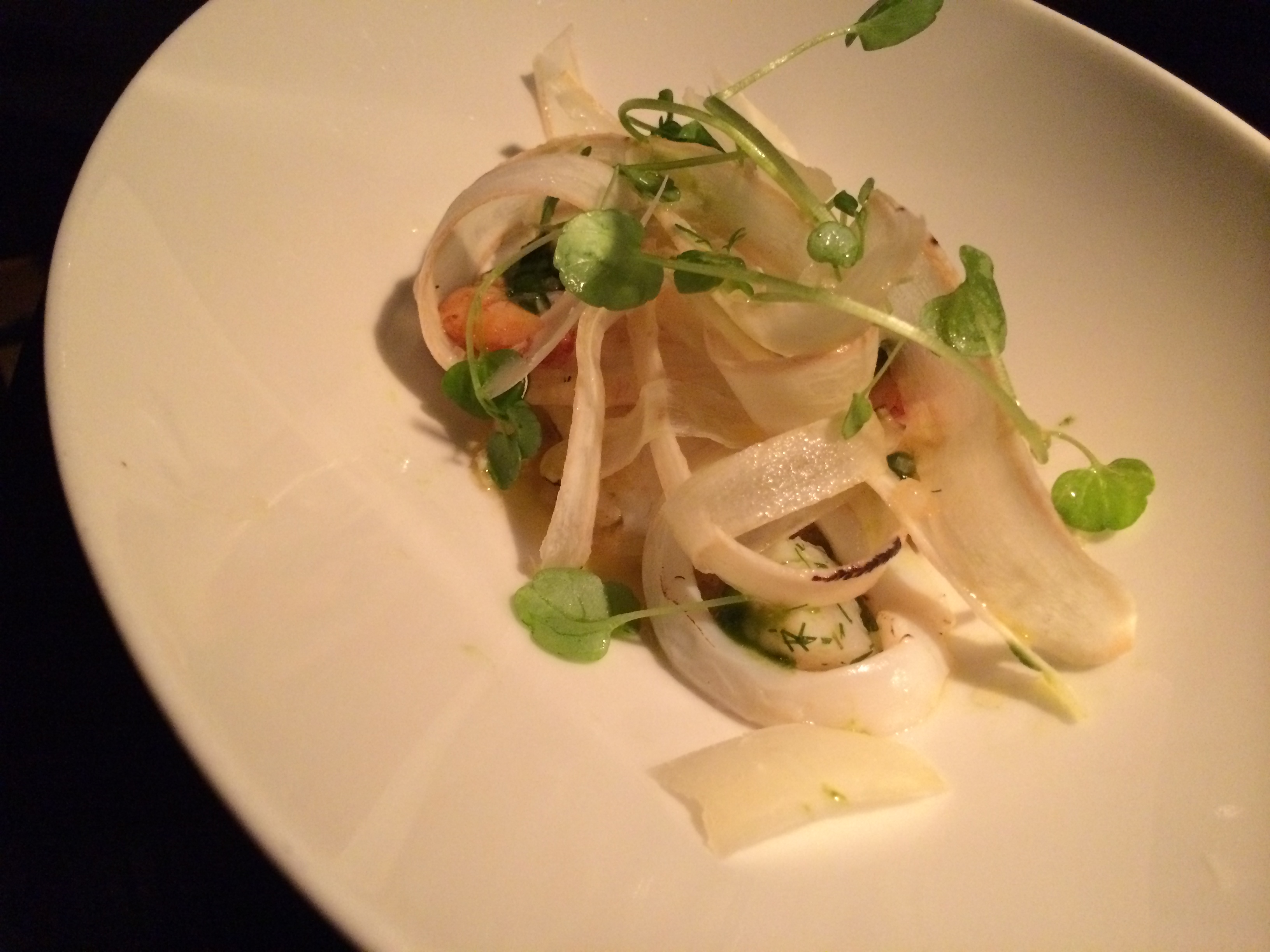 Fyrsti rétturinn er skemmtilegt dæmi um hvernig þetta er útfært á Fiskifélaginu. Fullkomin rauðspretta og á stangli á diskinum líka sýnishorn af hörpuskel, tígrisrækju og smokkfisk. Mjúk smjörsósa umlykur fiskinn og með þessu svartrót, sneidd niður í örþunnar ræmur áþekkar tagliatelle pasta. Og með þessu hvítvínið Tommassi Appassimento Bianco.