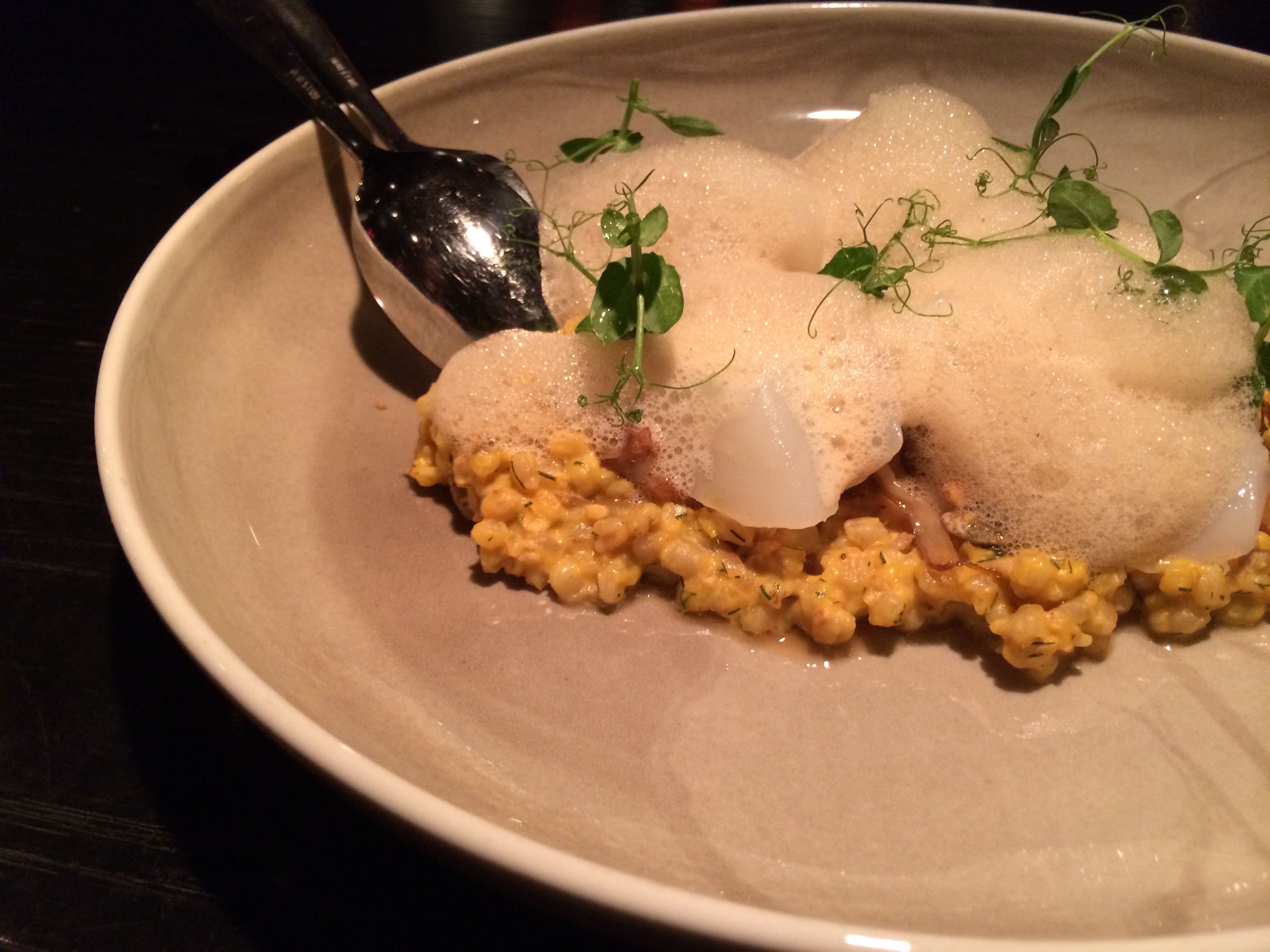 Það hélt líka áfram með næsta rétti. Saltfiski með byggottó – það er risotto með íslensku byggi. Það var fallega gullið á lit, í því var grasker, sem gaf því sætu, mjúkt og kremað. Saltfiskurinn var mjög mildur og útvatnaður og yfir þessu villisveppafroða en lúðursveppir voru einnig hluti af réttnum.
