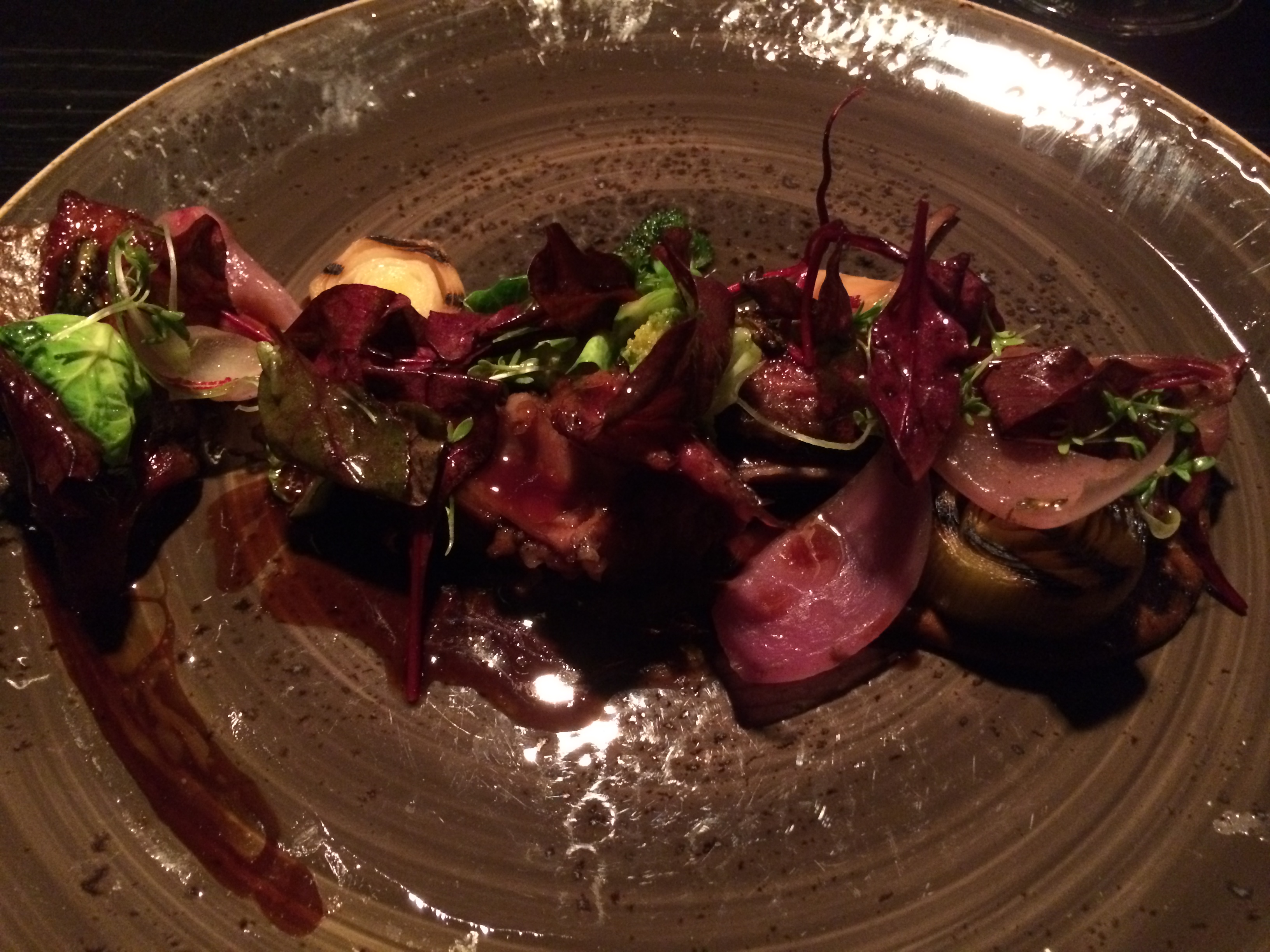 Næst komu skornar kálfaþynnur, kaldar. Þær eru kallaðar osso buco en hafa þó ekki þetta langeldaða yfirbragð, líklega nafngiftinn sótt í merginn sem var sneiddur í þunnum skífum yfir og þær bræddar með gasloga. Samhliða komu líka sultaðir tómatar með basil, stökku parmesankexi, tilbrigði við Caprese-salat. Þarna var farið yfir í rauðvín – Chianti frá Ruffino.