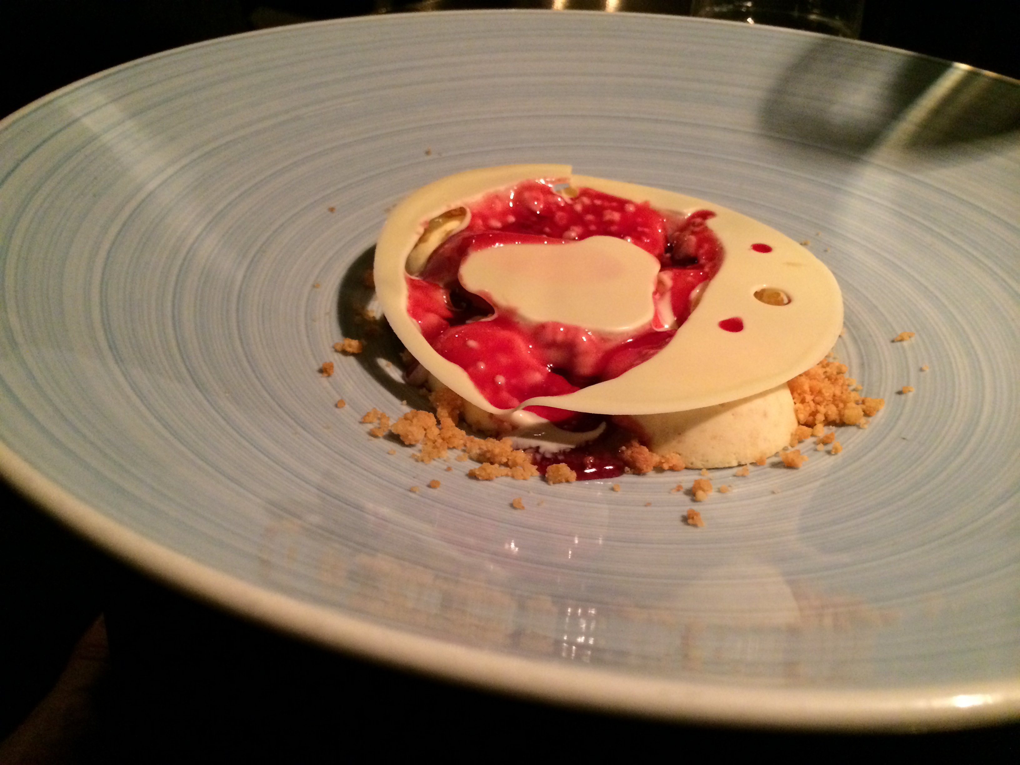 Eftirréttirnir voru tveir. Fyrst Limoncello- ís, sætur og sítrónumikill og síðan Tiramisu-afbrigði. Átti kannski ekki mikið sameiginlegt með tiramisu annað en að þarna einhver staðar voru ladyfingers. Yfir þessu var skífa af hvítu súkkulaði og hindber settu ansi mikinn svip á réttinn. Með þessu Martini Asti, sætt freyðivín.